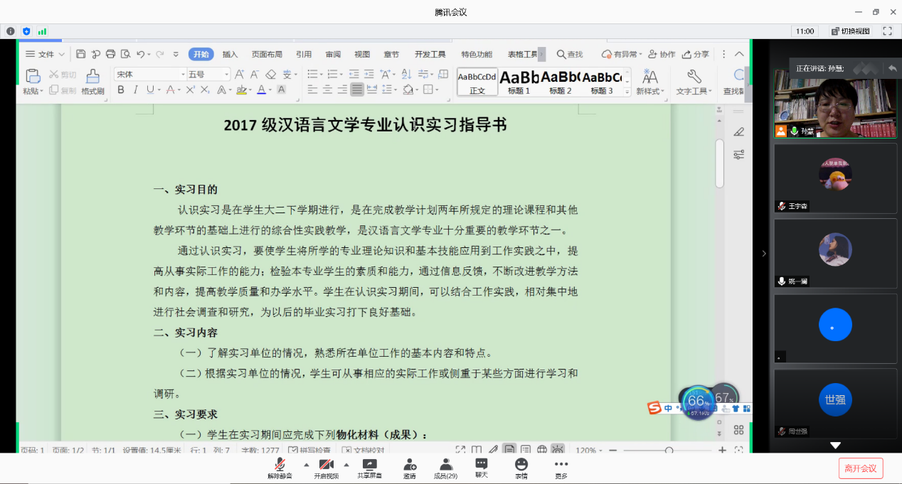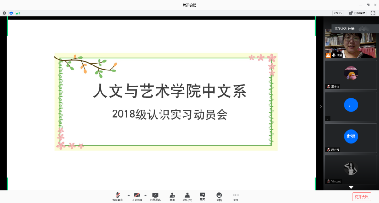 汉语言文学专业2018级认知实习工作顺利进行,7月2日晚8时,中文系主任孙慧老师通过腾讯会议召开认知实习动员大会,汉语言文学专业2018级全体本科生参与了本次动员会。