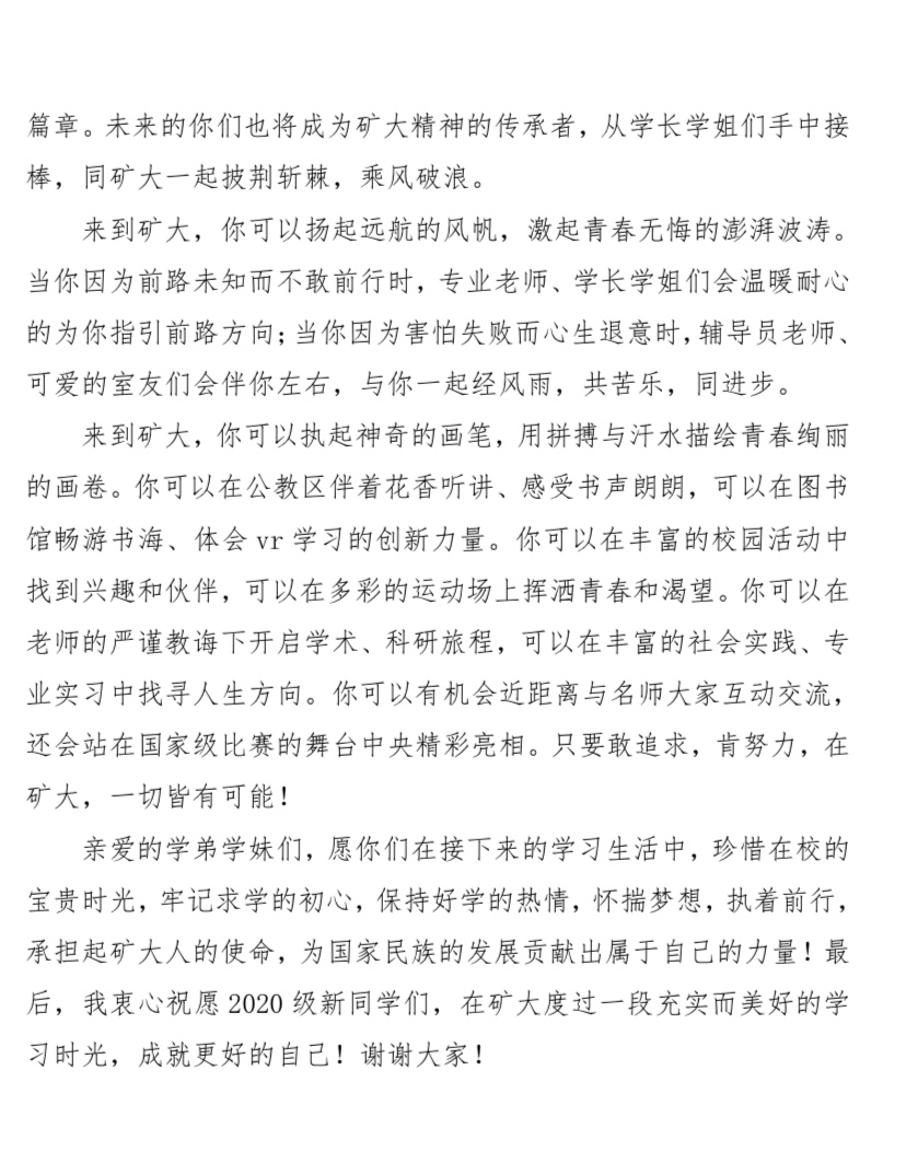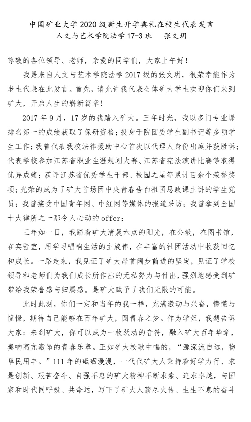 必发 2017级本科生法学系张文玥同学作为在校本科生代表在校2020级新生开学典礼上进行发言。张文玥同学代表全体矿大学生表达了对于2020级新生到来的欢迎,她在发言中分享了在矿大三年多的时间里,她在学习、生活等各方面的收获与成长,希望新一代矿大学子保持求学的初心和好学的热情,怀有梦想、坚定追求、拥抱时代、砥砺前行。并且祝愿学弟学妹们珍惜在校时光,保持求学的初心和好学的热情,在百年矿大,圆青春之梦。