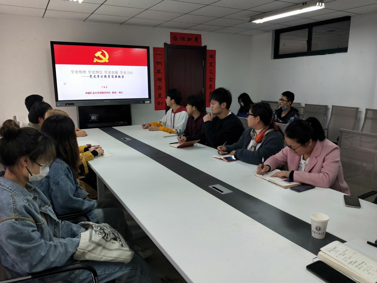 党委副书记丁恒星老师做党史学习教育报告,各年级辅导员老师和学生代表参加学习。