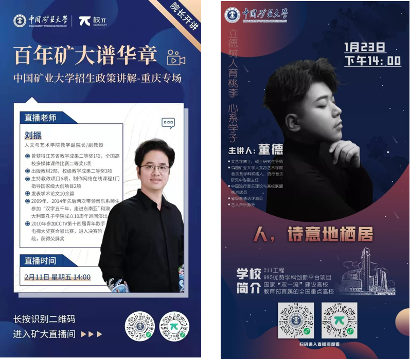 长刘振副教授、青年教师董德博士分别在线上开展《院长开讲|矿大直播嘉年华,重庆专场》、《人文艺术精彩来探》直播。