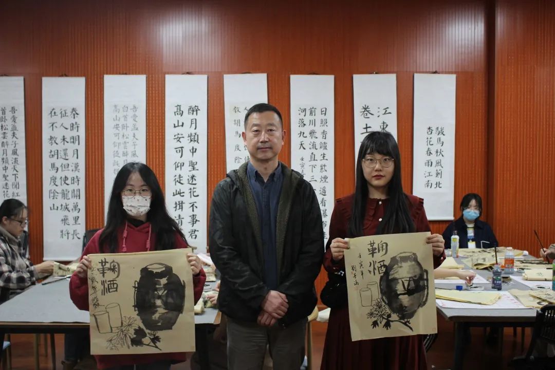 王磊老师特意将画中元素拆分,示范了“菊酒”二字的写法,坛身、酒杯等画法,教与练结合,以更利于同学们学习。在此过程中,同学们动手实践,体验写毛笔字、描绘国画。同学们尽情发挥自己的才能与想象,将热情泼洒在画纸上,尽显青春的风采。活动现场,气氛融洽,老师与同学积极交流互动,同学们认真练习。韵藏笔墨,字为心声,同学们字迹各有特点,风格多变,或豪放潇洒,或柔婉缠绵,充分展现了自身独特的精神风貌。