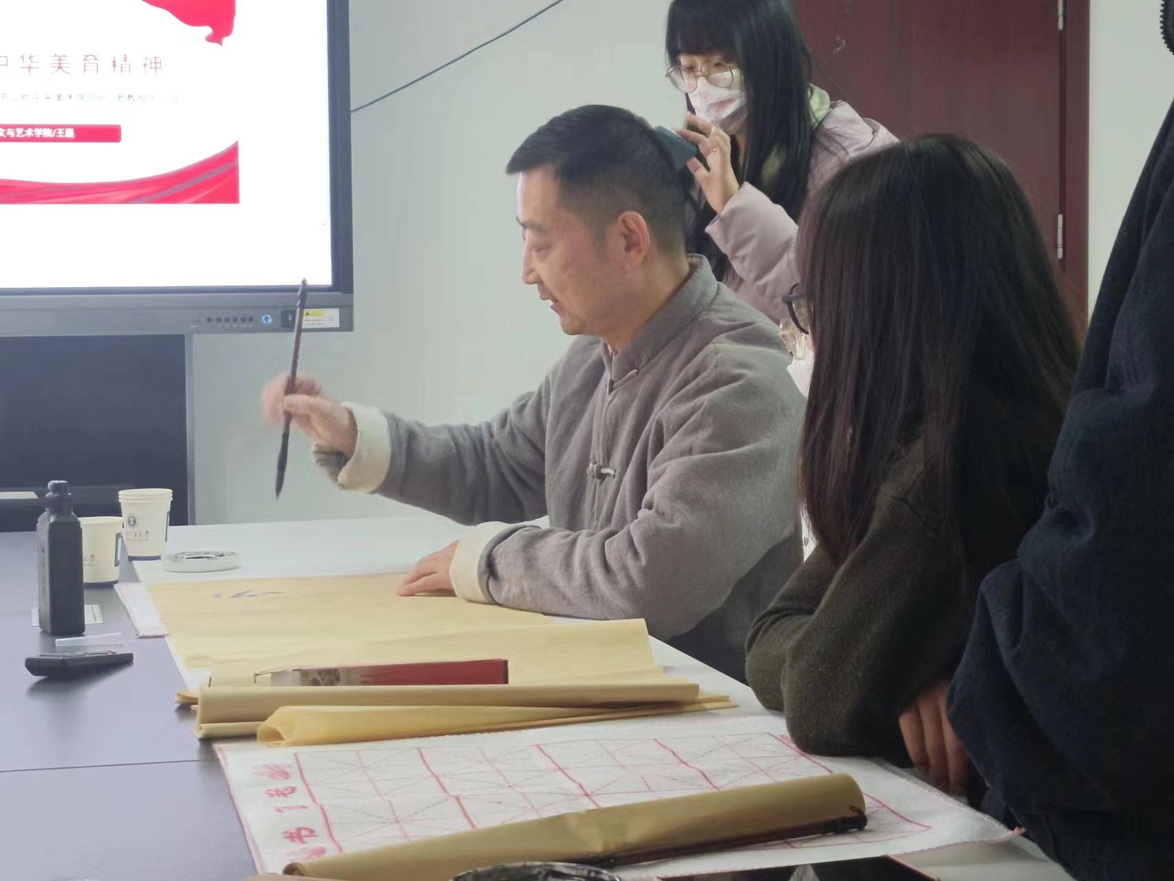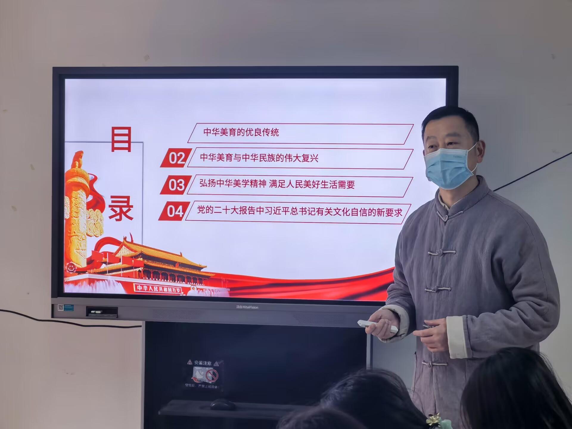 这次活动以“理论+实践”的形式展开。在理论教育环节,王磊老师介绍了中华美育的雏形——乐教,引导同学们了解中华美育的起源,并讲述了鸦片战争后至改革开放这一时期的美学发展,让同学们欣赏不同阶段美学的不同类型。随后,王磊老师向同学们讲述如何实现中华文化复兴,强调当代青年要坚守中华文化的立场,传承中华文化的基因,弘扬中华美学精神。