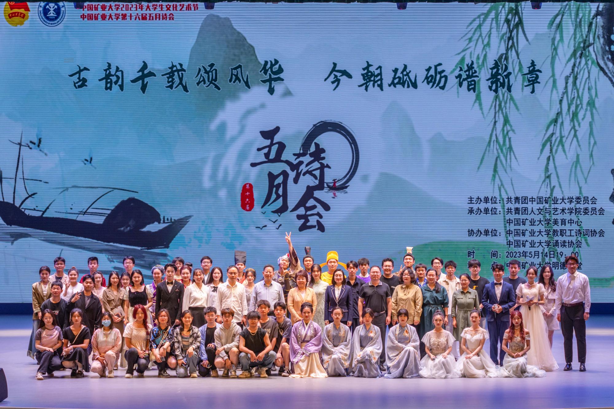 承办的中国矿业大学2023年大学生文化艺术节系列活动之“古韵千载颂风华,今朝砥砺谱新章”第十六届五月诗会汇报演出在明德礼堂举行。