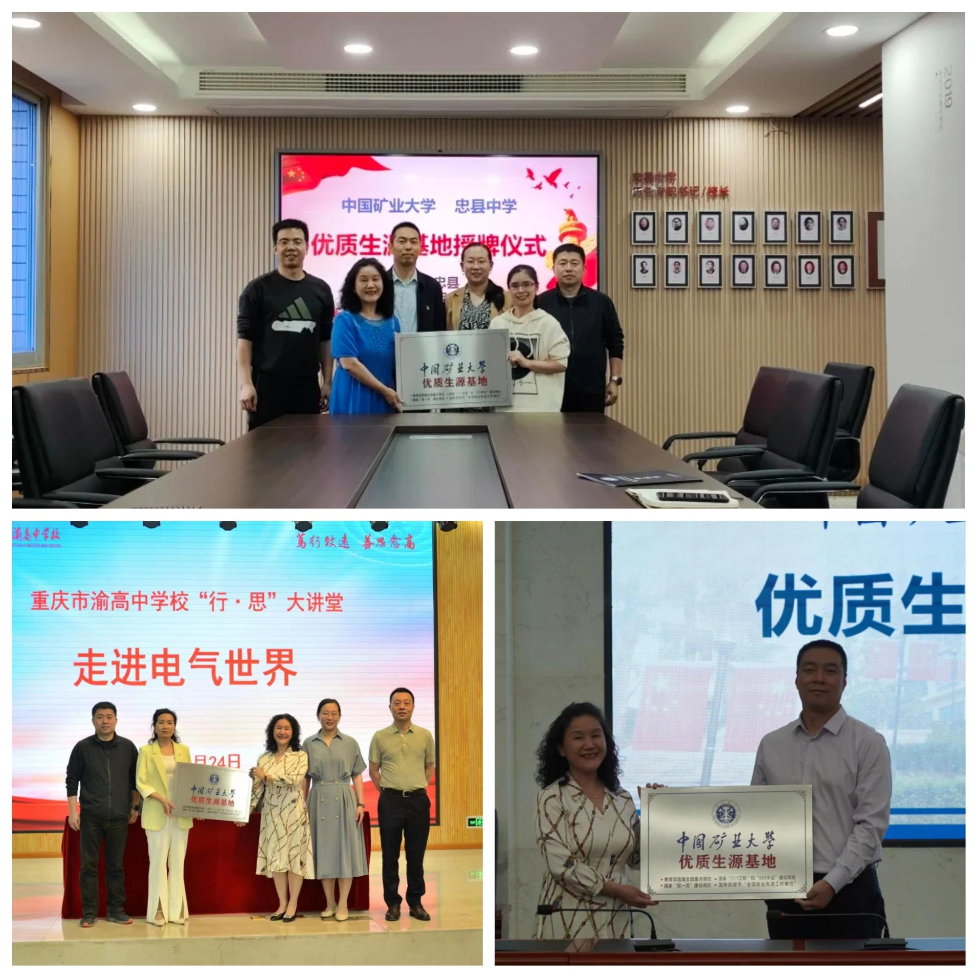 王青教授向三所学校授“中国矿业大学优质生源基地”铭牌,并以《来百年矿大圆青春之梦》面向重庆市朝阳中学校师生作讲座。