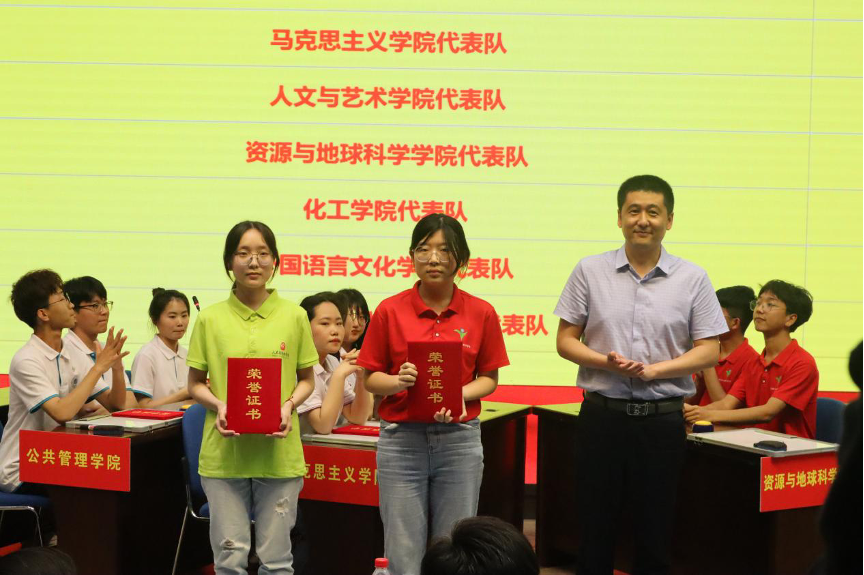 汉语21-4班秦越蕾、汉语22-4班袁嘉晟、汉语22-4班崔舒茗三位同学组成得到代表队在决赛中展现了丰富的知识储备和良好的精神风貌,最终获得二等奖,张瑞亭老师被评为优秀指导教师。