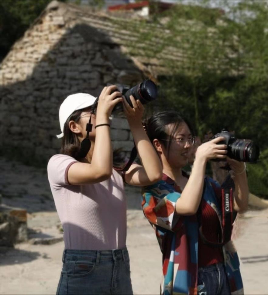 参赛学生周燕琴与拜婉馨在北村村石屋参观并取景