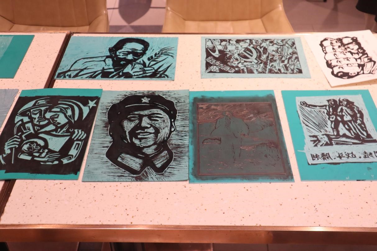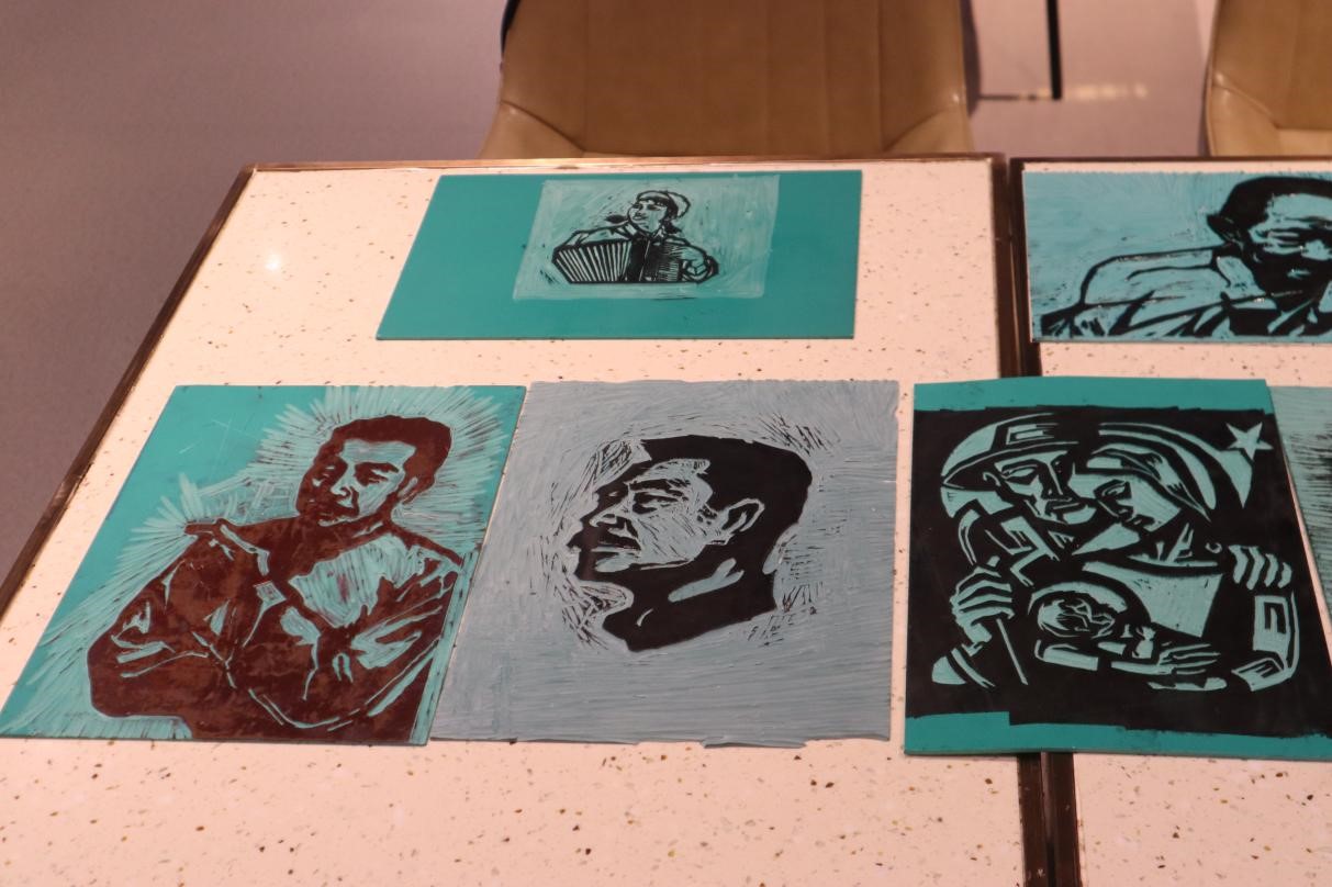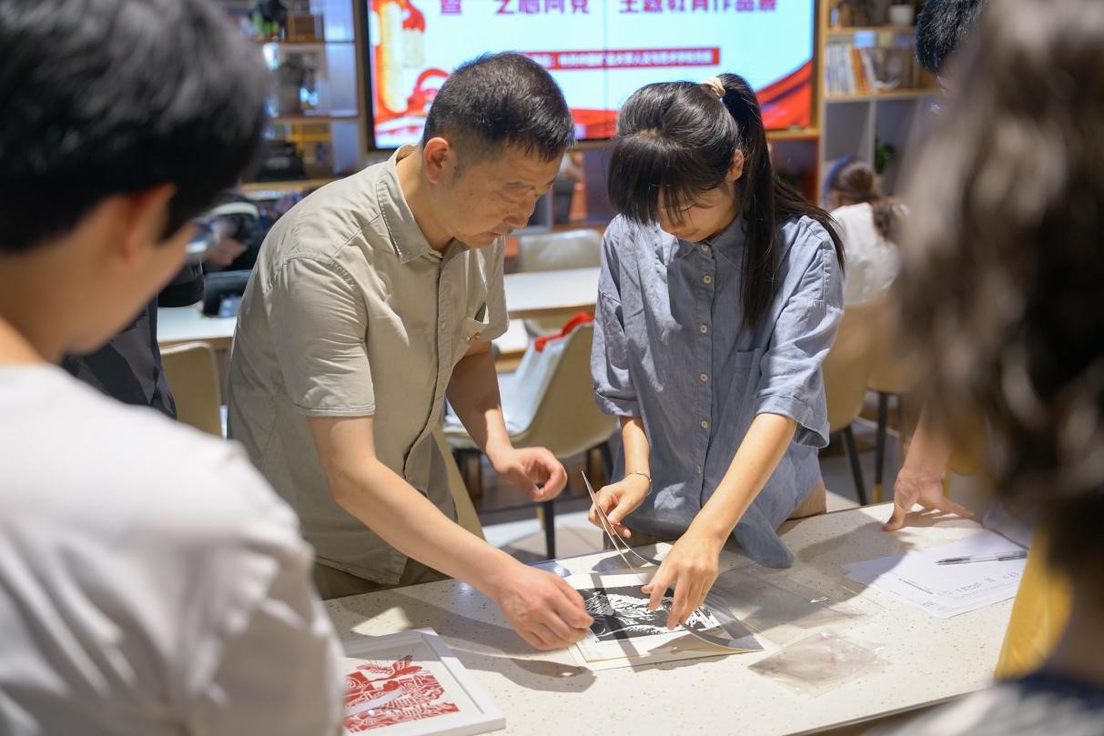 作品展出现场,王磊向师生介绍了新兴木刻版画创作兴起的历史背景和制作方法。他讲到,木刻版画是延安革命文艺美术创作中成就最显著的领域,民众文化水平有限,艺术家们在极其艰苦的条件下,通过刻板绘画方式宣传革命,唤起群众的爱国意识。他指导师生们现场体验了版画绘制、雕版和拓印等流程。方跃平书记充分肯定本次展出作品题材丰富、细节精美,是一次极有意义的献礼活动。他希望要持续推进“艺心向党”主题教育,让学生在丰富的体验创作中受教育、长才干。