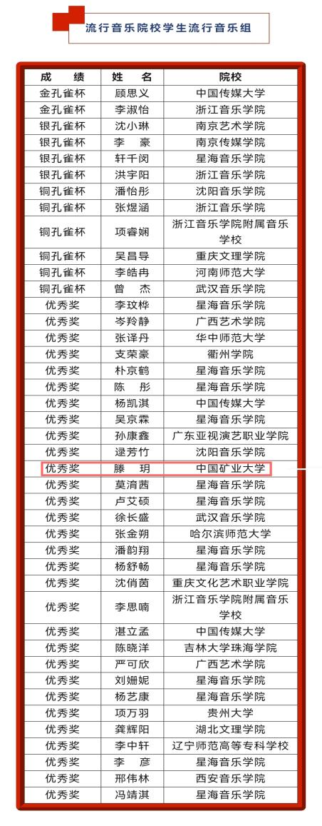 董德老师对滕玥同学的参赛曲目进行多次辅导,根据滕玥同学的嗓音特质选择难度较高的参赛曲目,并前往杭州一路陪伴指导。从流行音乐院校学生流行音乐组144名选手中脱颖而出,进入全国总决赛,再到排名全国23位获得优秀奖,这是中国矿业大学在该赛事中的历史性新突破,也是我校学生在该赛事中取得的最好成绩。不仅扩大了学校的知名度,也极大地激励鼓舞了我校师生在音乐艺术上的不断追求、不断努力。