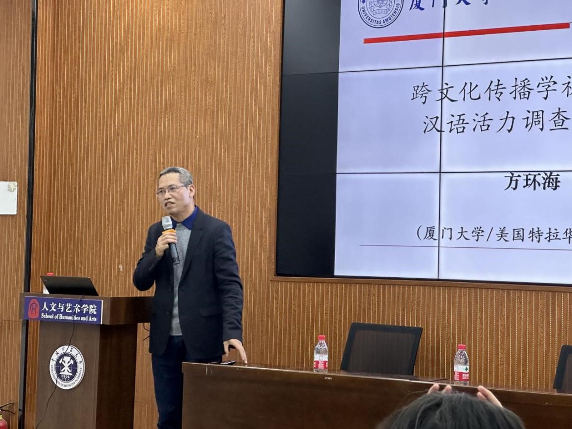 做题为“跨文化传播学视域下的汉语活力调查与评估”的讲座。讲座由汉语言文学系赵鸣副教授主持,新闻传播学系曹洪洋、何双秋、封雷、郑一萌等教师,以及部分中国语言文学和新闻传播系研究生参加。