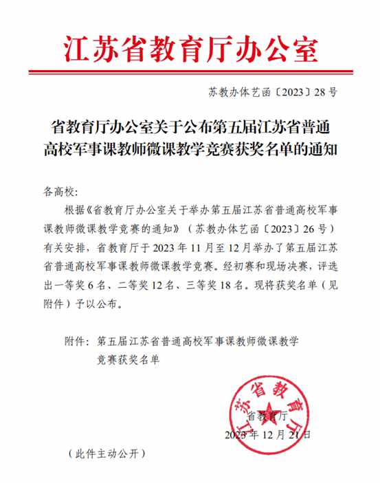 近日,江苏省教育厅发布《省教育厅办公室关于公布第五届江苏省普通高校军事课教师微课教学竞赛获奖名单的通知》,必发