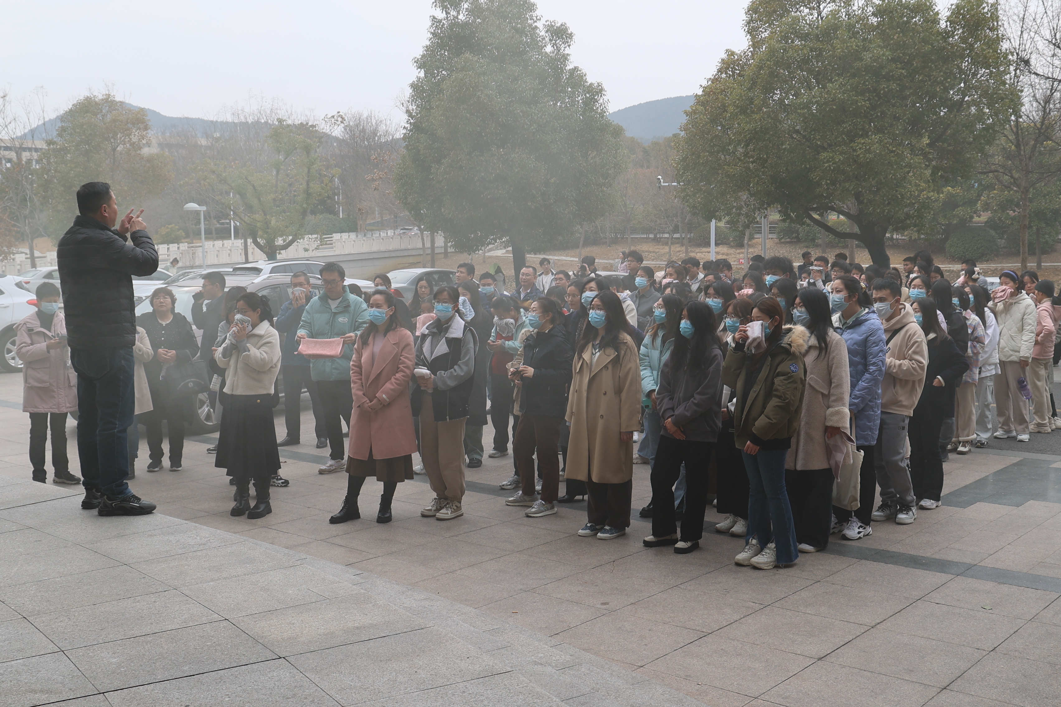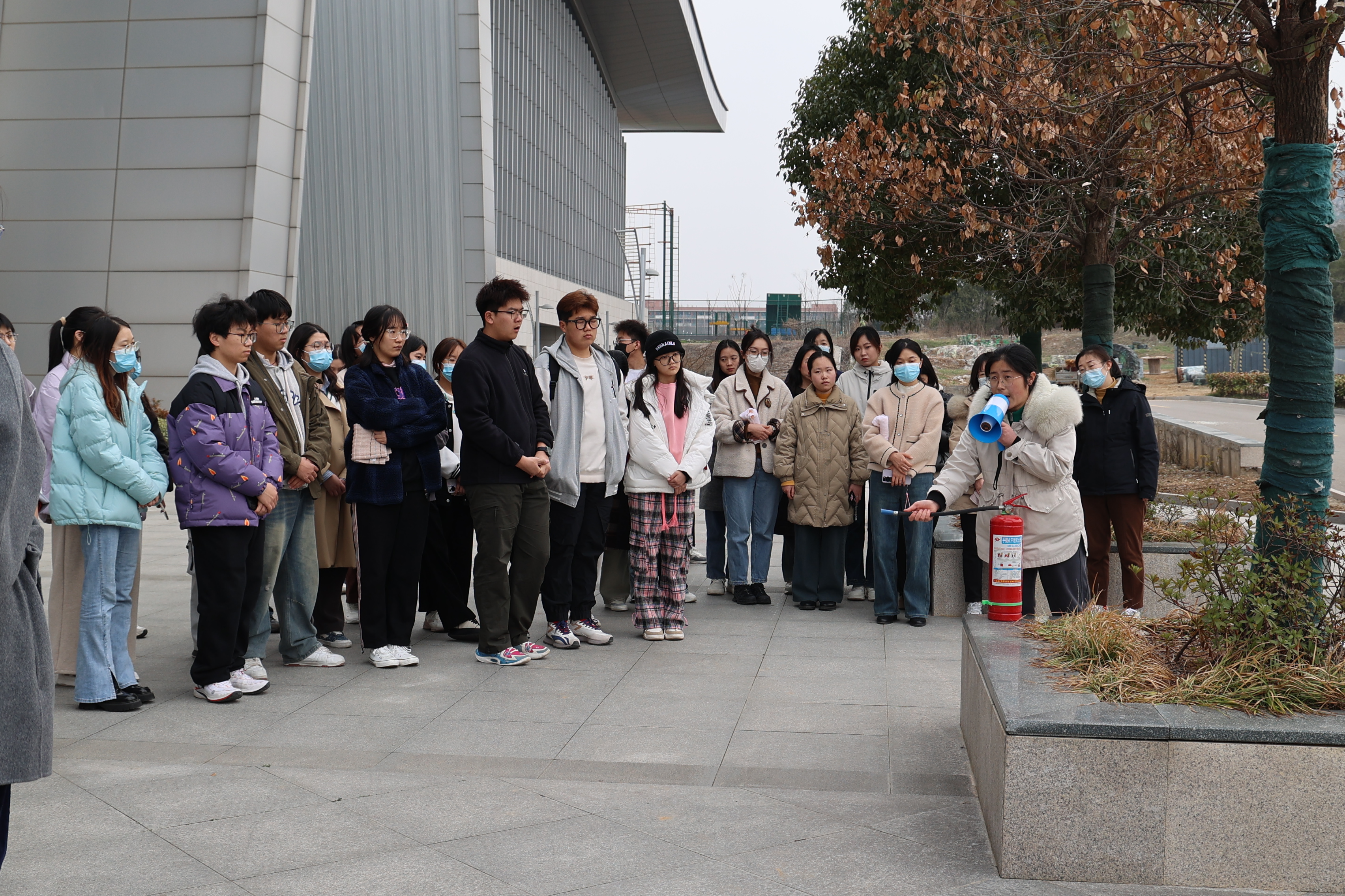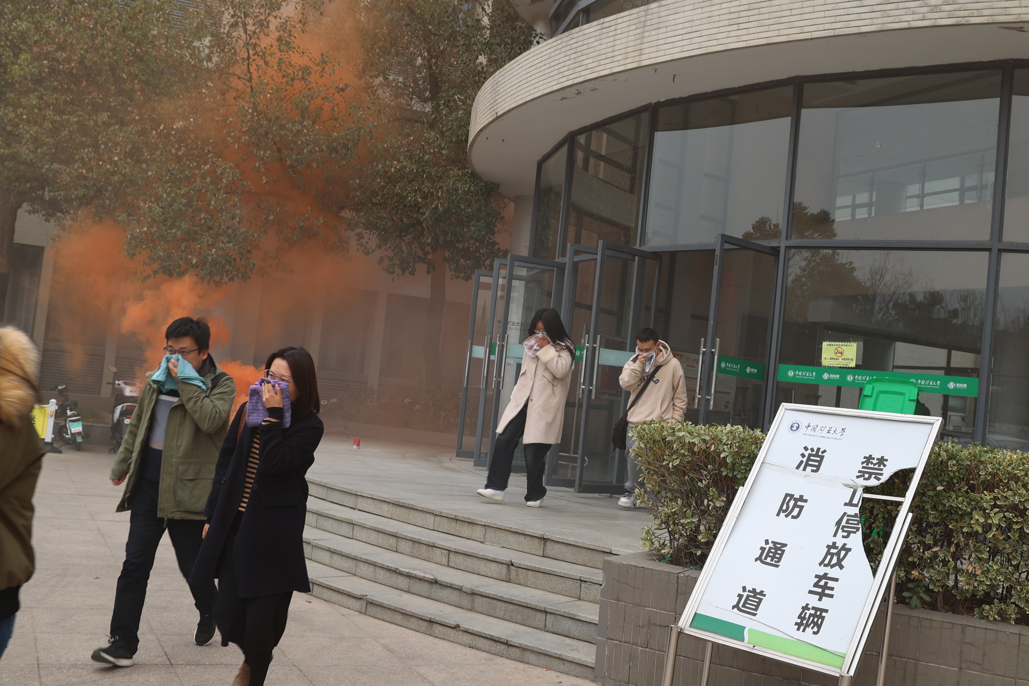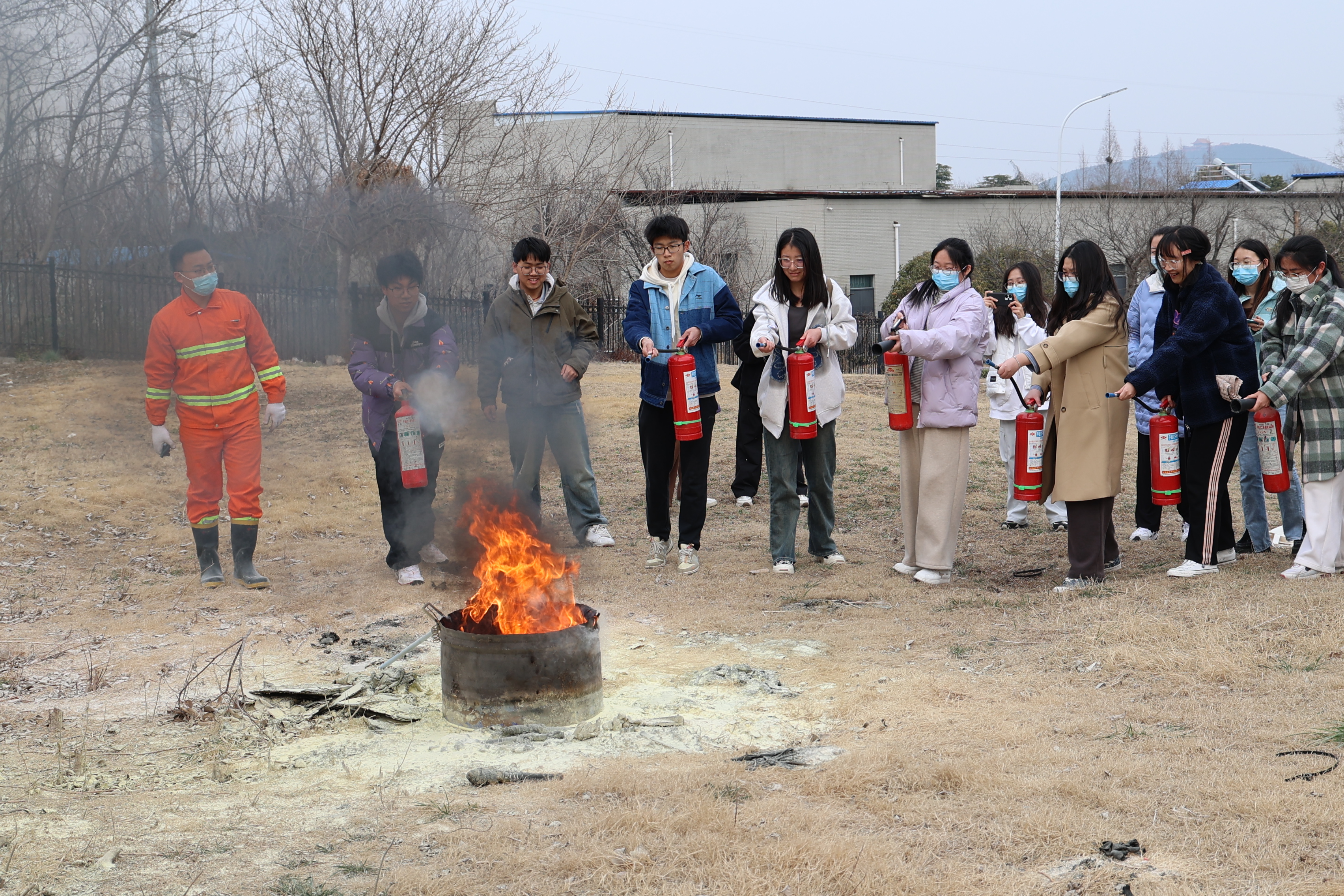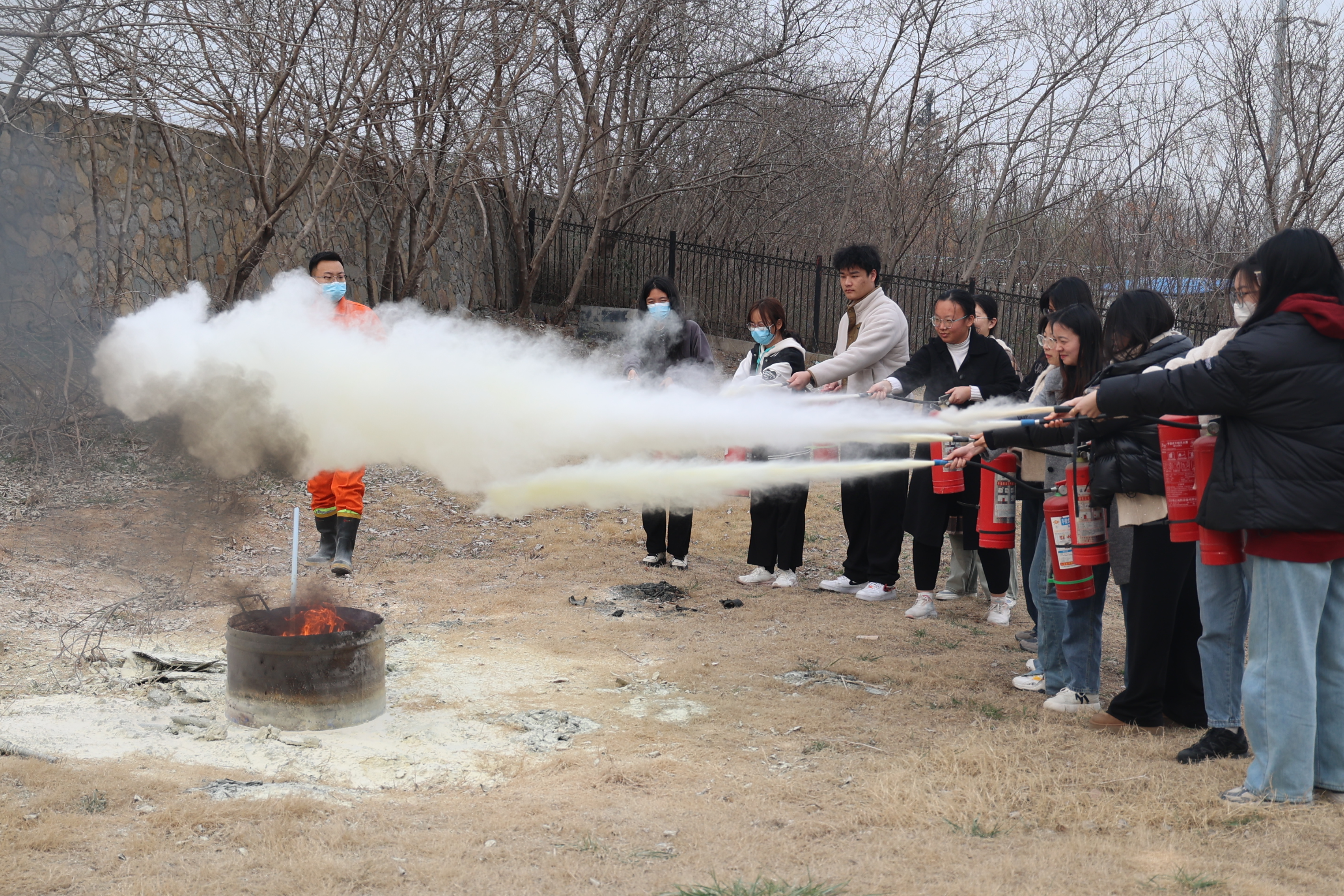 下午3时30分,消防演练正式开始。文科楼一楼大厅散发人工烟雾,模拟火情发生。演练现场的师生们迅速对火灾事故做出反应,用湿毛巾捂住口鼻,弯腰低头有序跑出楼道,疏散至文科楼前空地。随后,师生们在安全员的带领下至体育馆后侧空地学习灭火器的正确使用方式和注意事项,并分批进行实操训练,掌握了扑救初期火灾的操作方法。