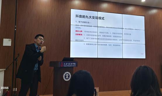 张明主任随后对于本次培训活动目标及内容做了简要介绍,张明主任以多年培训工作经验指出学以致用的重要性,希望同学戒骄戒躁以高度的热情参与到本次活动当中。开班仪式结束后,陆健老师以抖音案例为切入点,在上午培训中为同学进行了别开生面的案列教学,同学踊跃参与到教学互动当中,对抖音有了更加直观明了的认识;下午的培训以理论知识为主要内容,陆健老师详细介绍了抖音的算法机制和传播特点,为进一步的实践教学做好准备。培训结束后陆健老师布置了极具特色的抖音实践作业,为本期培训圆满画上句号。