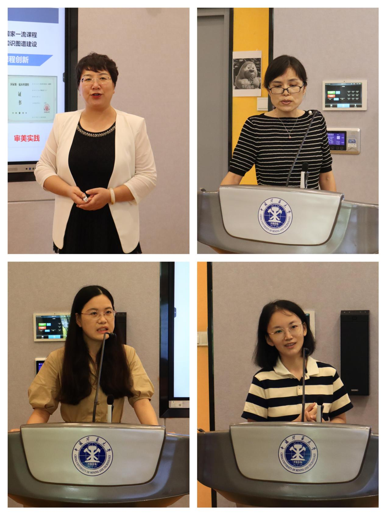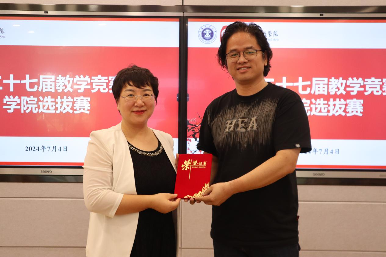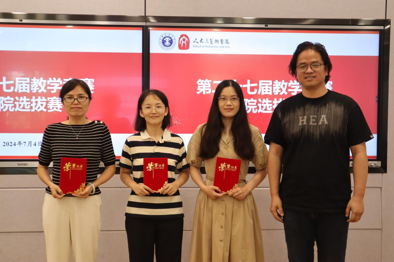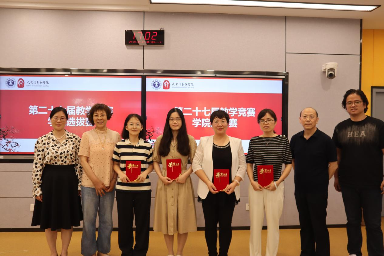 经过角逐,刘振副院长宣读获奖名单。孙慧老师荣获教学创新赛道一等奖。课堂教学赛道牛菡老师荣获一等奖,朱荣荣、骆云两位老师获二等奖。奖状由边和平教授、温晓慧教授和丁昶教授颁发。比赛结束后,出席领导、评委以及参赛老师合影留念。