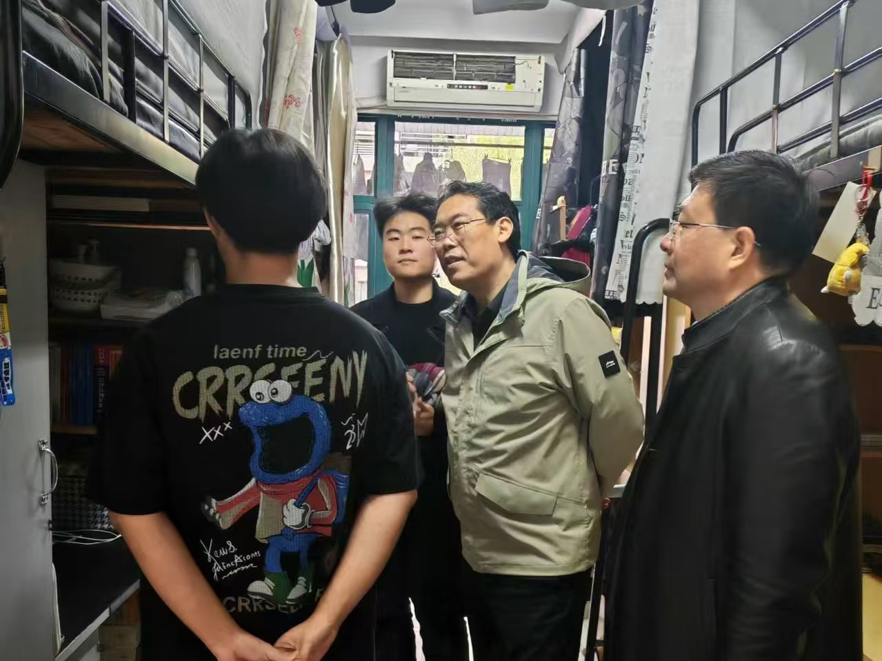丰富的教学资源与学术氛围,努力提升自我。同时,赵书记还十分关心同学们的课余生活,对大家的兴趣爱好、社团活动参与情况等一一询问,他还不忘提醒同学们注重宿舍卫生与个人健康,整洁舒适的居住环境对于学习与生活都有着积极的促进作用。他鼓励大家以宿舍为单位,加强团队协作,积极参加体育锻炼,共同营造良好的宿舍文化氛围,增进室友间的友谊与凝聚力。李广文指出宿舍安全是学校安全稳定工作的重要环节,同学们要牢固树立安全意识,严格遵守学校的各项规章制度,严禁使用违规电器,注意防火、防盗、防诈骗,共同营造安全、和谐、有序的宿舍环境,并对整洁干净的宿舍提出了表扬,热心解答了同学们在宿舍生活中出现的问题。