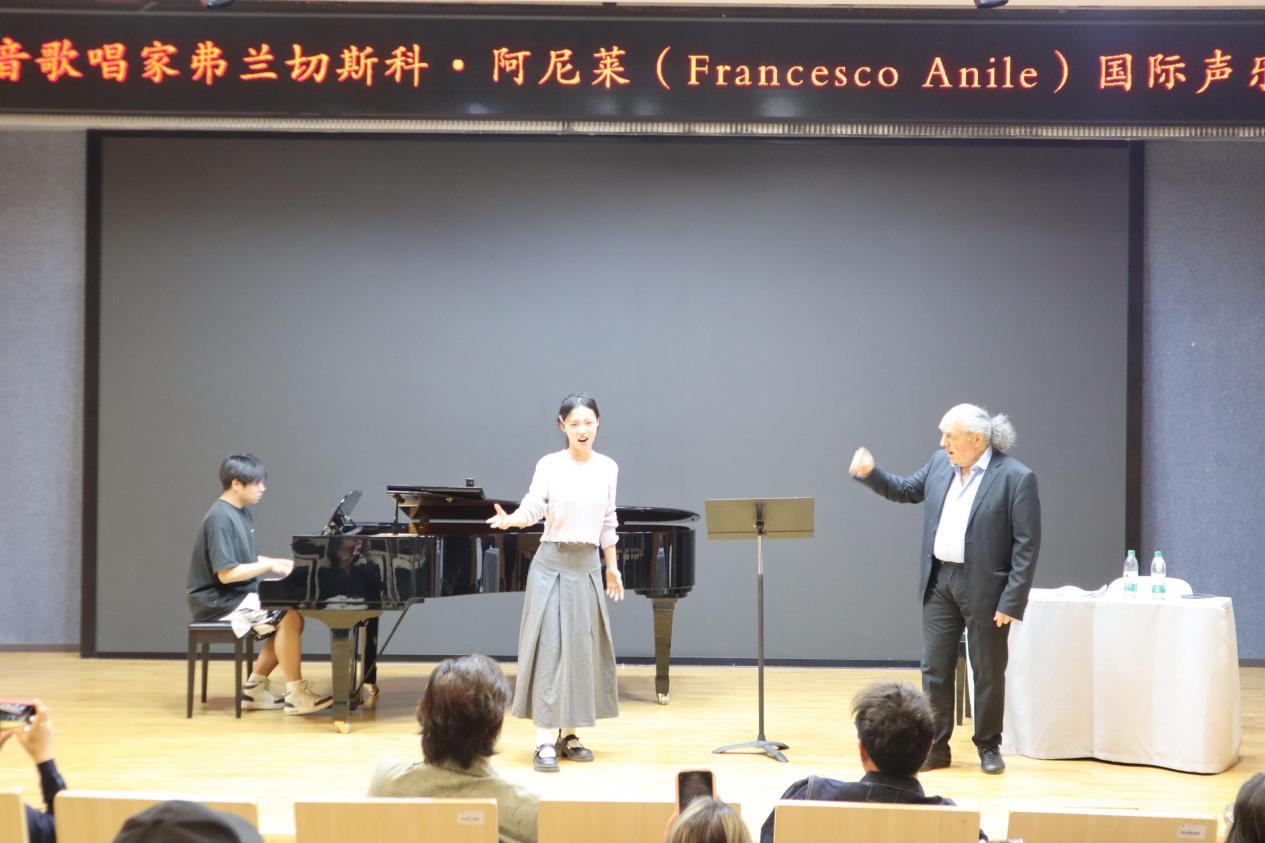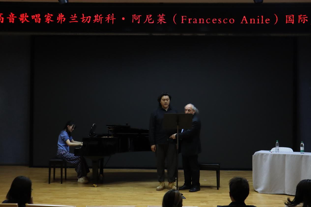音乐厅开班,音乐系部分师生参加。阿尼莱以“人声乐器的专业塑造”为主题,讲解声乐基础理论,阐释呼吸控制、共鸣原理等要素。十余位声乐专业的同学依次表演世界著名歌剧选段,阿尼莱采用“诊断式”点评,提出改进方案并示范教学。课程最后,阿尼莱与音乐系教师宋国旭、Francesco Algeri共同登台,演唱了普契尼歌剧《西部女郎》中的《请让他相信》《穿上戏袍》等经典唱段。