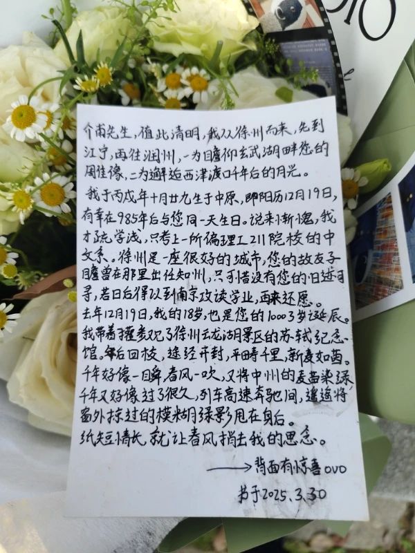 学子李晨岩于南京玄武湖畔书信寄情北宋政治家、文学家王安石的文化寻踪之旅。据了解,李晨岩在清明假期沿王安石旧迹游学,以一封饱含深情的书信,串联起徐州、南京、镇江三城文化纽带,引发广泛关注。