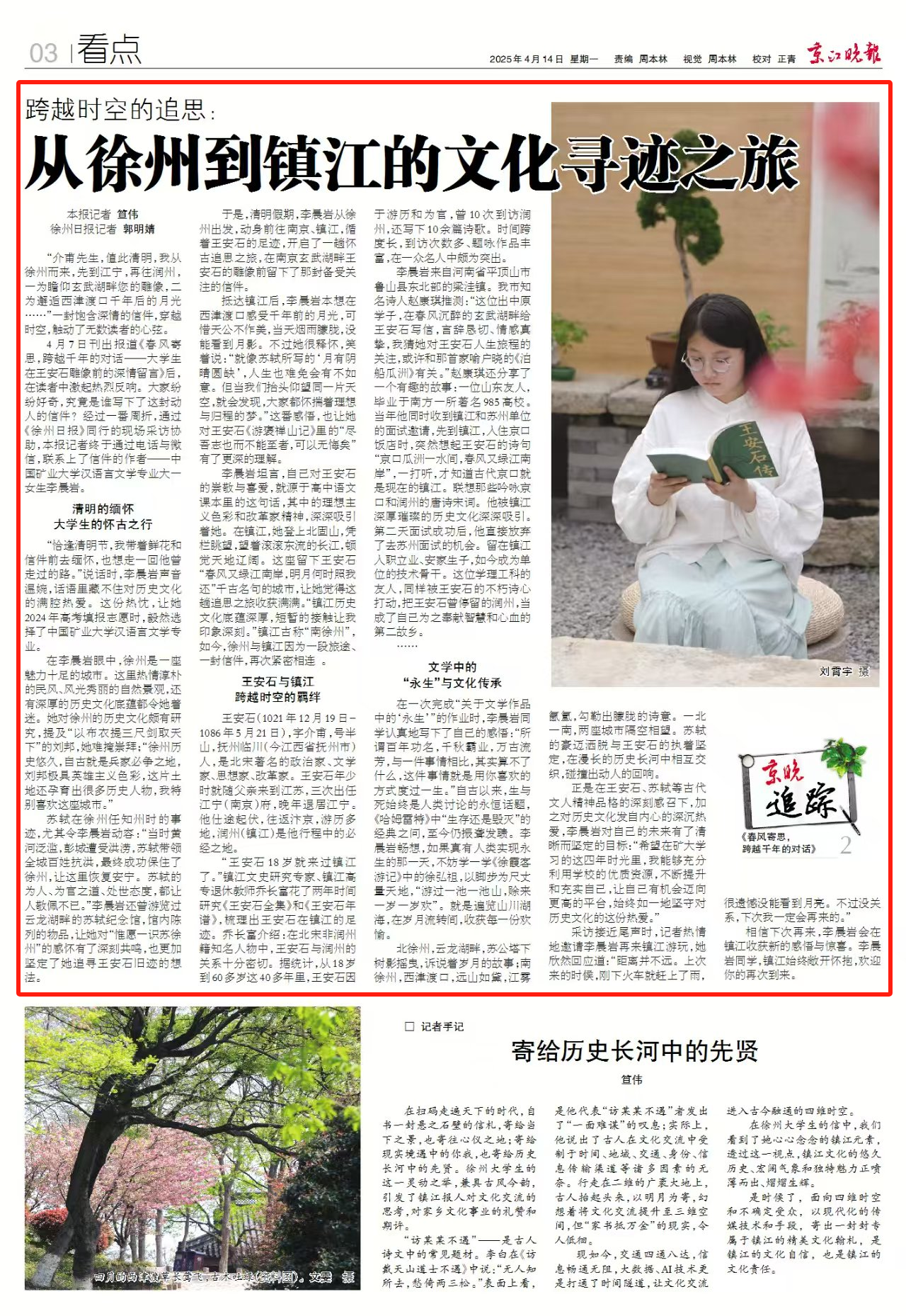 2024级汉语言文学专业学生,热爱历史文化。清明期间,李晨岩从徐州出发,先后探访南京玄武湖与镇江西津渡。从玄武湖畔的书信,到徐州、南京、镇江三城的文化追踪,李晨岩以当代青年的独特视角与真挚方式,展现了在徐学子对优秀历史文化的热爱与传承,彰显出我校深耕文化育人、厚植历史底蕴的教育成果及青年学子昂扬向上的精神风貌。