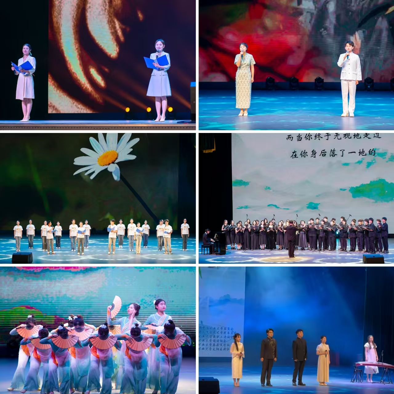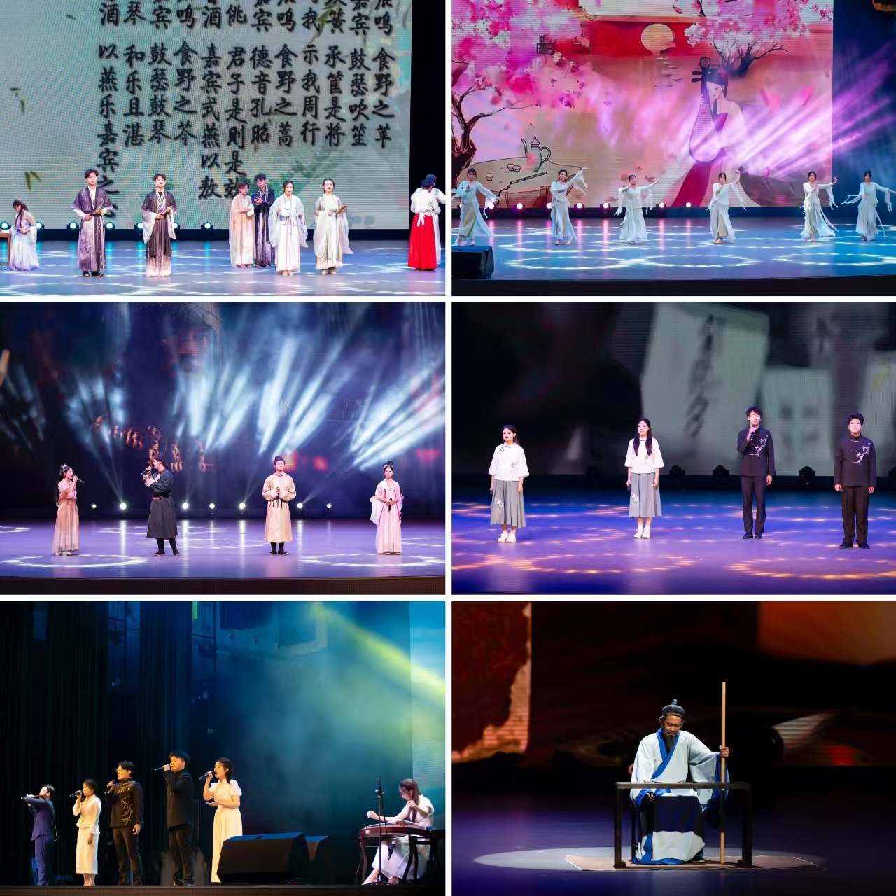 60余名学生参与本次演出,前期彩排打磨节目十余次。《醉春风》《鸳鸯戏》等节目展现了“春风拂槛露华浓”的古典意韵,将春日的诗意呈现于舞台之上;《风雅》《大唐诗人传》等节目以古韵悠长的词句重现《诗经》中的千年文脉,以诗意的歌词旋律勾勒盛唐诗坛的璀璨群像;《不朽》《青春》等节目用充满活力又铿锵有力的声音,传递着新时代青年的激情与理想;《徐霞客游记》《马诗》《五四铭诗》《苏小小》等一系列节目以诗为魂、以艺为媒,将古典诗词的隽永意境与现代艺术的创新表达完美融合,诠释了家国情怀与青春理想,展现了同学们对中华优秀传统文化的深刻理解与创新演绎,为校园文化生活谱写了一曲诗意盎然的华彩乐章。