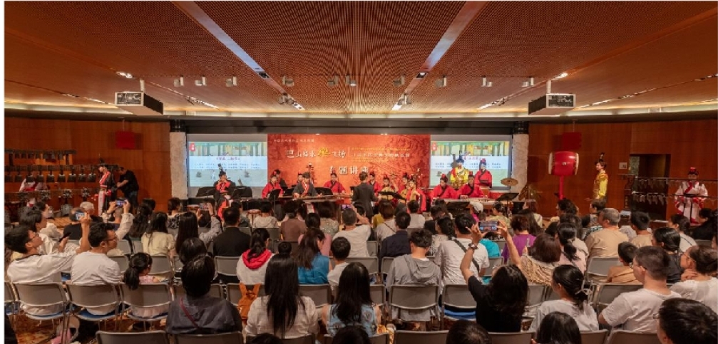 活动以“讲演结合”的创新形式,带领观众穿越千年时空,感受巴蜀音乐文明的独特魅力。主讲人王子初教授以“青铜礼乐到市井百戏”为线索,系统梳理了川渝地区音乐考古的重大发现,揭示了巴蜀音乐“从神坛走向人间”的演变轨迹。学校汉乐团师生历时数年复原仿制的编钟、编磬、瑟等汉代乐器悉数登场,现场演奏了《牧野》《小雅·鹿鸣》《扬州慢》《贺春·上林苑》《孔雀东南飞》《大汉气象》六部原创编配作品。整场演出由尤颢然老师作为导聆、姚佳慧老师作为指挥,宋国旭老师参演,还原了汉代乐曲演奏场景的庄重典雅,让观众近距离体会到传统乐器的独特魅力。展演期间,现场观众反响热烈,互动积极。