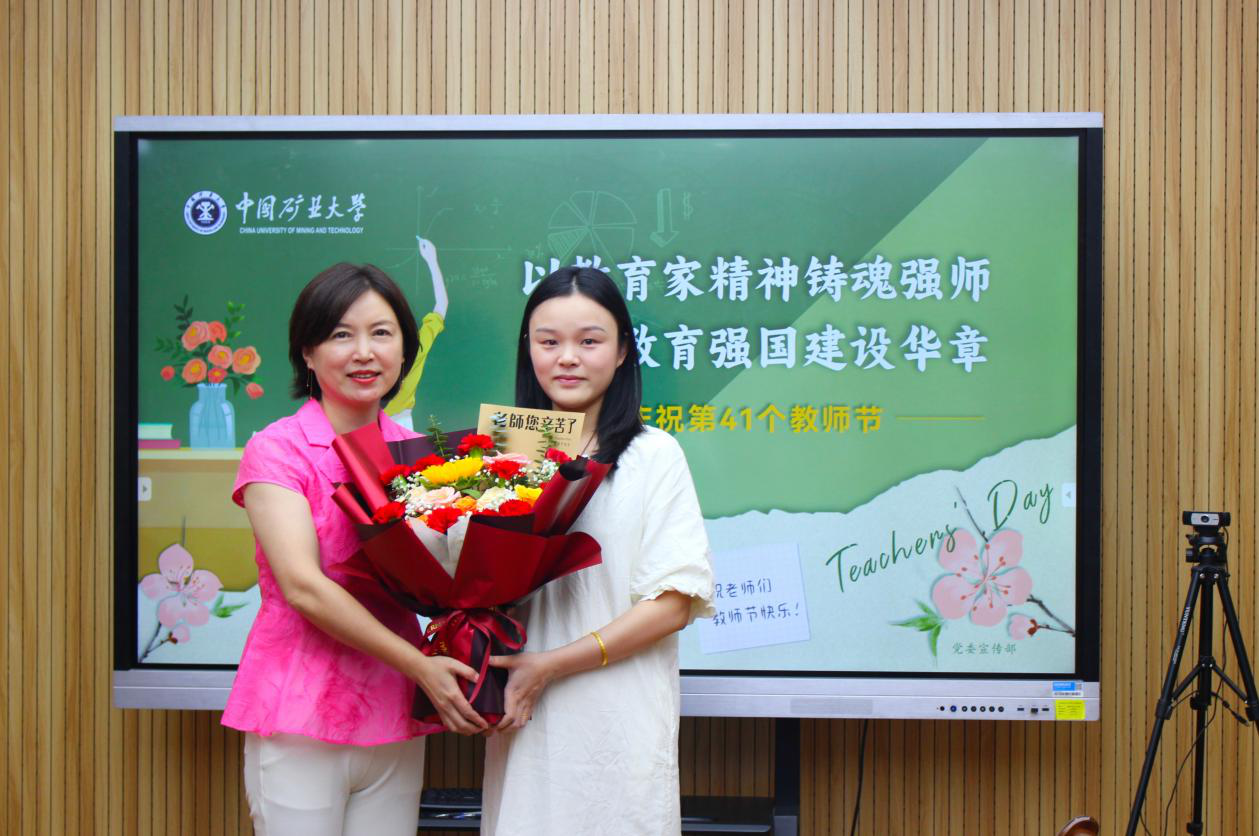 院学生会的同学们也走进课堂,为坚持在教学一线上课的老师们献上鲜花,送上真挚的祝福,表达对老师的感恩之心,并邀请老师集体合影留念。