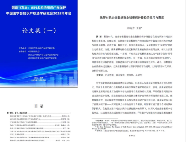 王轩与厦门大学教授林秀芹合作的《数智时代企业数据商业秘密保护路径的效用与限度》一文被年会论文集第一部分全文收录,并将在法律出版社出版;赵胤豪全程参与专题研讨,在学习前沿理论的同时展现了我校青年学子的学术热情与专业素养。