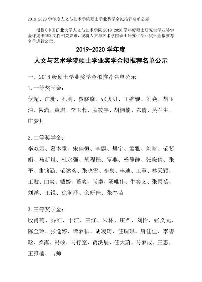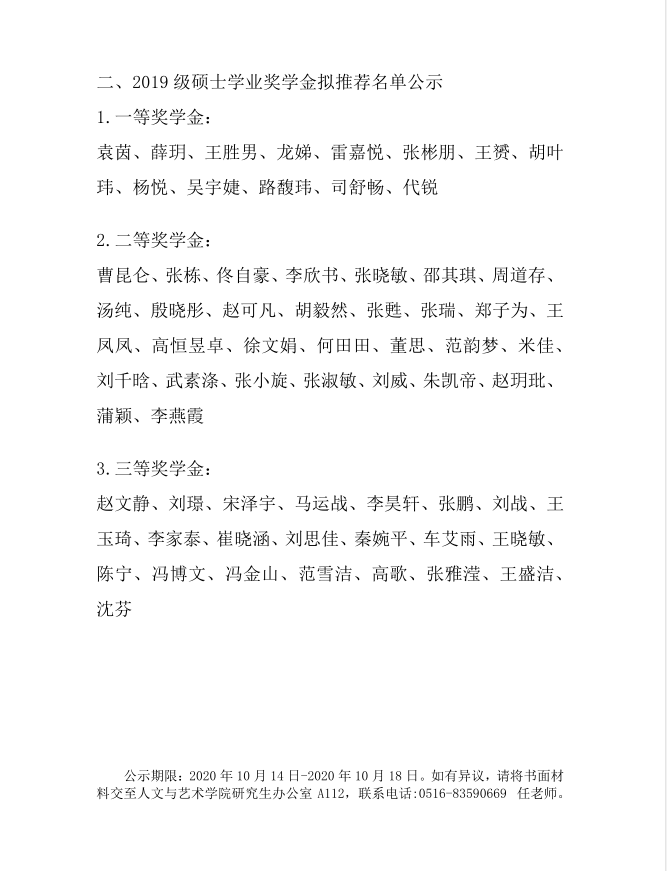 2019-2020学年度必发博彩 硕士学业奖学金拟推荐名单公示