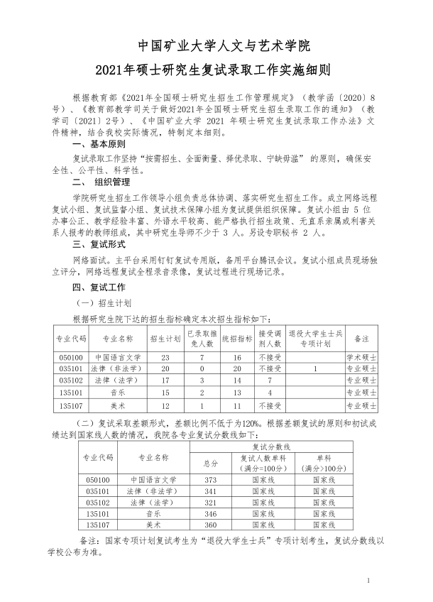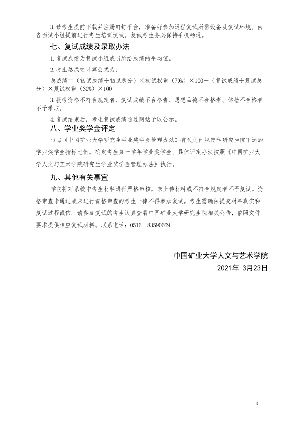 中国矿业大学必发博彩 2021年硕士研究生复试录取工作实施细则