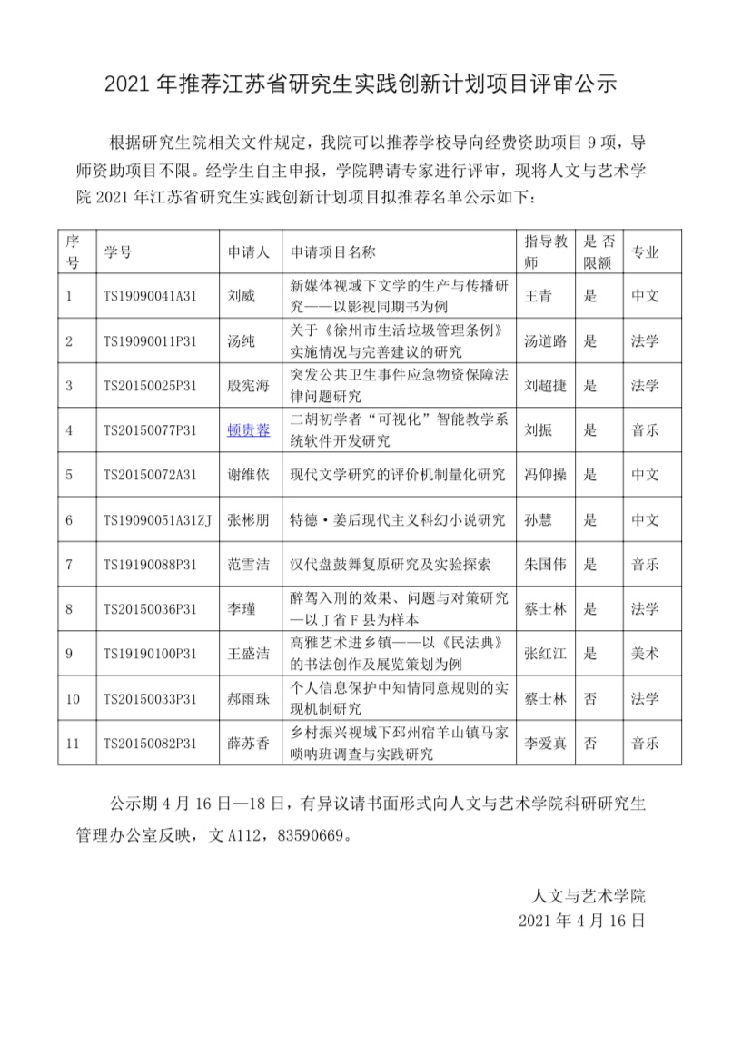 2021年推荐江苏省研究生实践创新计划项目评审公示