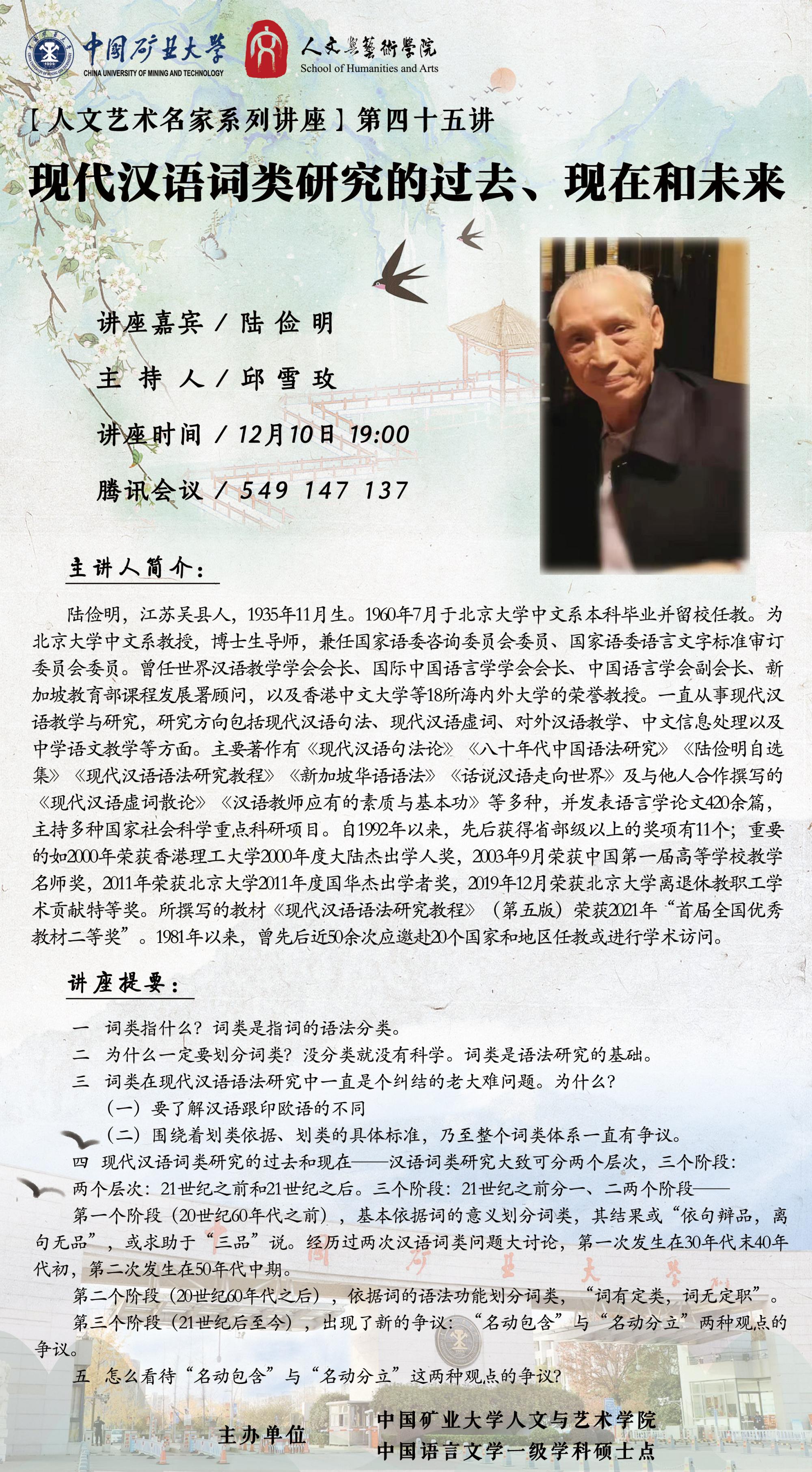 个人简介:陆俭明,江苏吴县人, 1935年11月生。1960年7月于北京大学中文系本科毕业并留校任教。为北京大学中文系教授,博士生导师,兼任国家语委咨询委员会委员、国家语委语言文字标准审订委员会委员。曾任世界汉语教学学会会长、国际中国语言学学会会长、中国语言学会副会长、新加坡教育部课程发展署顾问,以及香港中文大学等18所海内外大学的荣誉教授。一直从事现代汉语教学与研究,研究方向包括现代汉语句法、现代汉语虚词、对外汉语教学、中文信息处理以及中学语文教学等方面。主要著作有《现代汉语句法论》《八十年代中国语法研究》《陆俭明自选集》《现代汉语语法研究教程》《新加坡华语语法》《话说汉语走向世界》及与他人合作撰写的《现代汉语虚词散论》《汉语教师应有的素质与基本功》等多种,并发表语言学论文420余篇,主持多种国家社会科学重点科研项目。自1992年以来,先后获得省部级以上的奖项有11个;重要的如2000年荣获香港理工大学2000年度大陆杰出学人奖,2003年9月荣获中国第一届高等学校教学名师奖,2011年荣获北京大学2011年度国华杰出学者奖,2019年12月荣获北京大学离退休教职工学术贡献特等奖。所撰写的教材《现代汉语语法研究教程》(第五版)荣获2021年“首届全国优秀教材二等奖”。1981年以来,曾先后近50余次应邀赴20个国家和地区任教或进行学术访问。