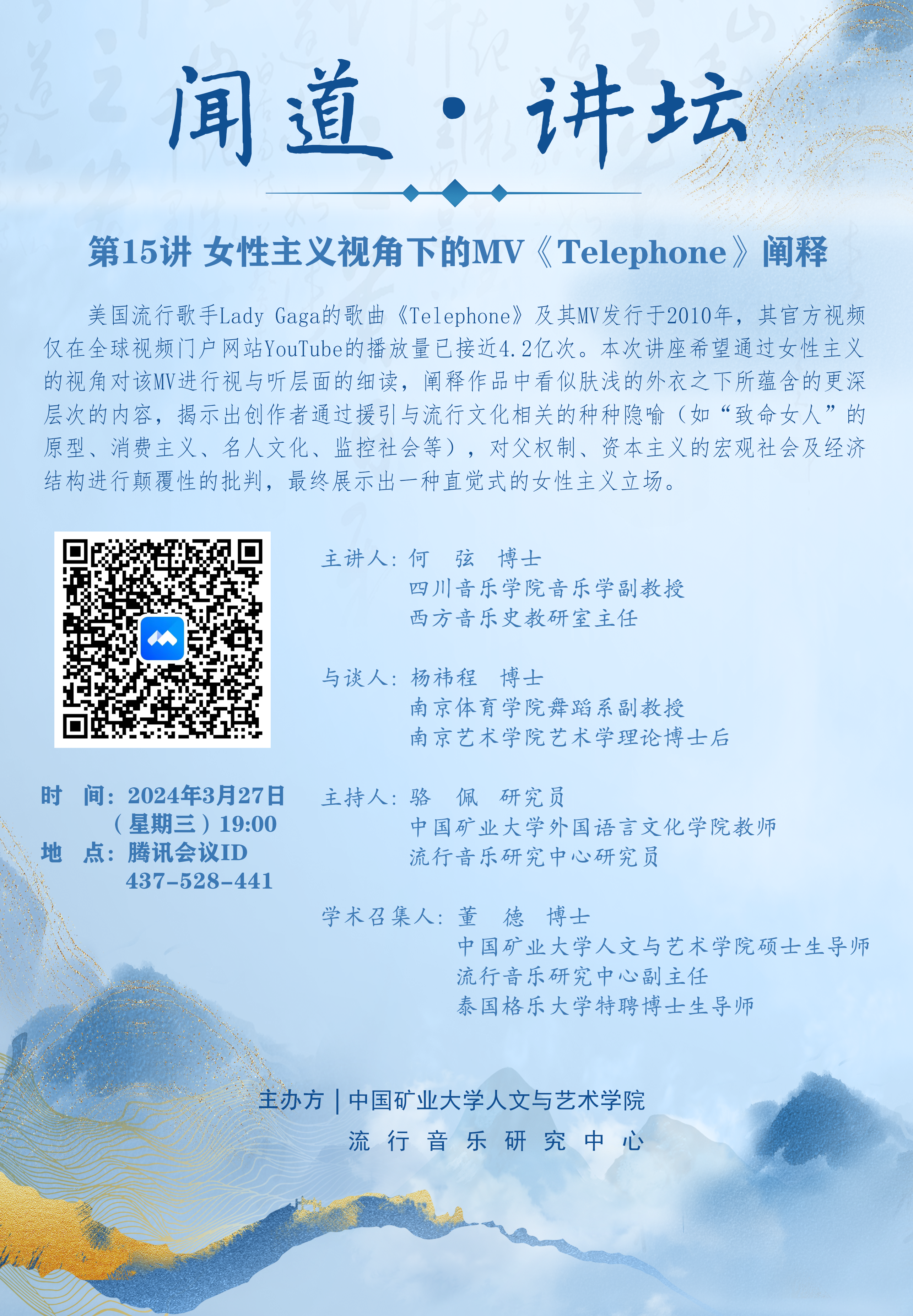 与流行音乐研究中心联合主办的“闻道”系列讲坛的第15讲顺利开展。本期的主题为“女性主义视角下的MV《Telephone》阐释”。由四川音乐必发