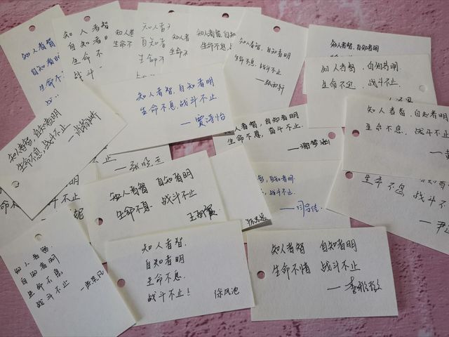 活动伊始,同学们纷纷发表了自己对于生命的理解。陈思逸同学说:“人的生命恰似一部小说,其价值在于贡献而不在于短长。人生路上无不经历坎坷与磨难,我们要明白生命因坚强而精彩!”肖瀚峤同学说道:“悦纳自我,是对自我的充分肯定,是对自我足够的重视与关注。岁月向前,应该赏识自己,宁可劳累,也不忘初心,向着完美。”随后,同学们在小卡片上写下了“知人者智,自知者明。生命不息,战斗不止”两句话并署上自己的名字,作为共同的勉励。