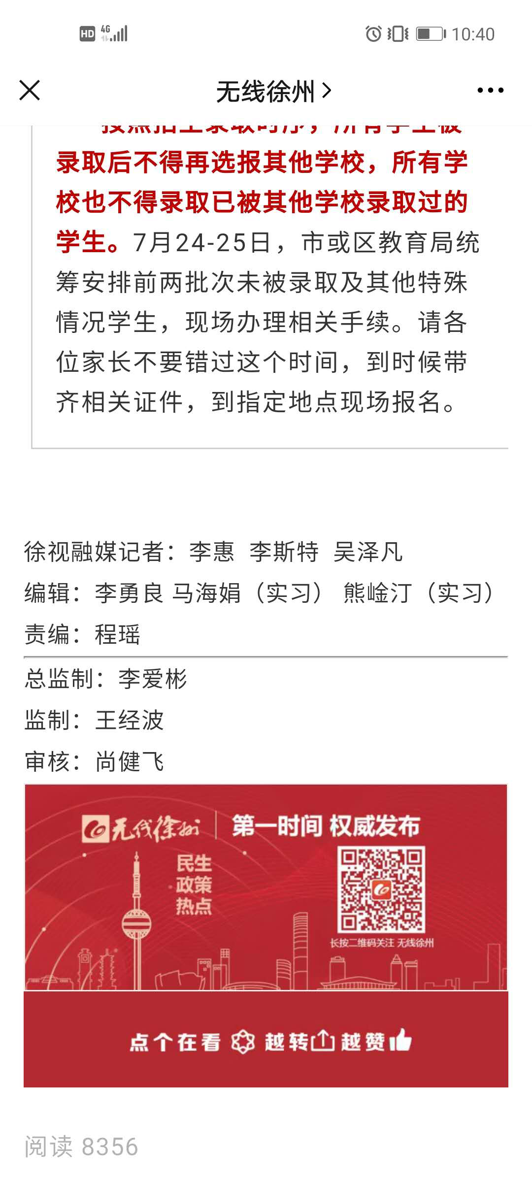在互联网平台编辑部的熊崯汀和马海娟同学,在责任编辑程遥老师的安排下,负责“无线徐州”微信公众号的运营。在老师的悉心指导下,两位同学的新闻编辑和改写的能力取得了长足的进步。“第一天老师主要先让我们好好揣摩无线徐州工作号以前的优秀文章,然后又对我们之前写过的文章细细点评。接下来的工作中,我们每天都要上网搜索各大政府机关的官网搜寻公告通稿,时刻关注本地、国内国际的热点。我们修改和整理完新闻稿件之后,指导老师又会带着我们一起再改一遍,通过老师的讲解,我们能看见自己改稿子出现的许多问题。”此外,熊崯汀和马海娟同学在“无线徐州”微信公众号编辑了《“小升初”没派上?没机会,补录机会来了!》、《33℃+暴雨!未来一周徐州将……》等多篇关于“文明创建”、“城市地图”等新闻稿件。