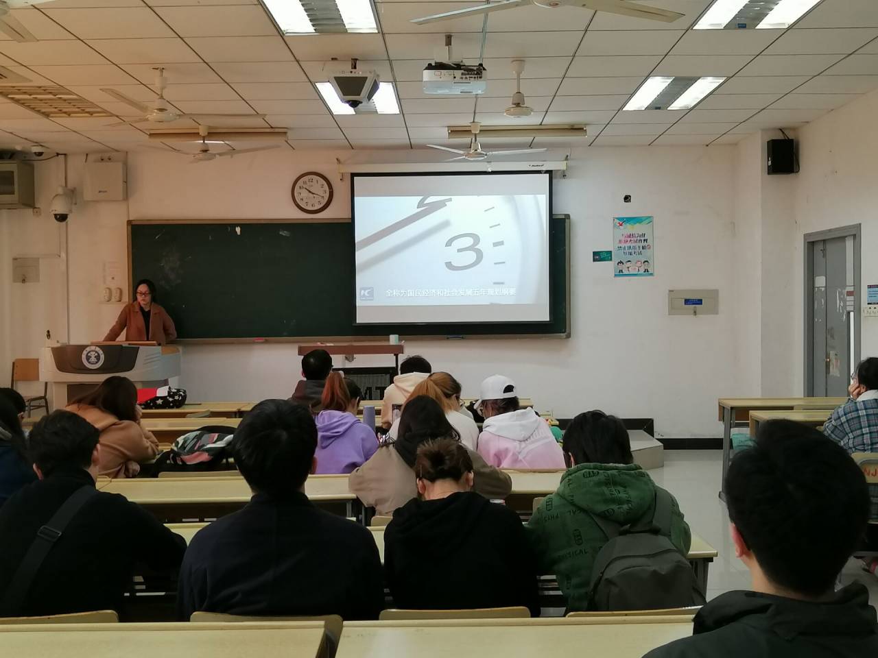 会议伊始,董婷玉同学介绍了本次班会的主题。她表示,中国共产党第十九届中央委员会第五次全体会议于2020年10月26日至29日在北京召开,全会听取和讨论了习近平总书记受中央政治局委托所作的工作报告。“十四五”时期是我国全面建成小康社会、实现第一个百年目标后乘势而上开启全面建设社会主义现代化国家新征程、向第二个百年奋斗目标进军的第一个五年,为了解国民经济和社会发展规划,作为大学生应该积极学习第十九届五中全会精神。董婷玉同学也希望通过本次活动可以使同学们明白我国目前发展环境面临的深刻复杂形势,积极应对国内外的机遇与挑战。接着,董婷玉同学和大家讨论了“十四五”规划中的远景目标与十二项重要举措,更好地增加了同学们对我国未来发展的认知。随后,董婷玉同学向大家放映了中英文版本的经济发展视频,并通过互动提问的方式交流了大家的看法。她表示,这次班会活动有利于同学们更好地了解有习近平同志作为党中央的核心、全党的核心领航掌舵,有全党全国各族人民团结一心、顽强奋斗,全国人民就一定能够战胜前进道路上出现的各种艰难险阻,一定能够在新时代把中国特色社会主义更加有力地推向前进。另外,她也要求同学们平时要更加积极主动地探寻“十四五”规划和2035愿景下的“发展”。上午11时,本次班会正式结束。
