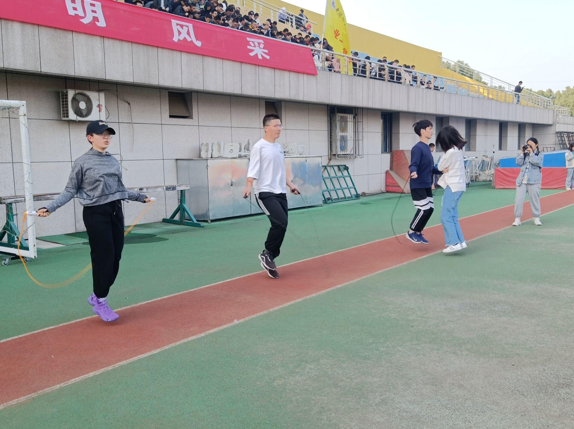 每场比赛,同学们都积极参加,全身心的投入到比赛中。在袋鼠跳比赛中,大家用大布袋套住下半身,双手提着布袋口向前跳,跳到终点脱下袋子交给队友接力,同学们比赛着速度;众人一条心比赛要求15人肩搭肩,从起点起跑,不可出现摔倒和放手的现象,手始终在另一个队员的肩上,同学们互为战友,一同前进;绳比赛中,同学们身姿矫健,“绳”彩飞舞,舞出了矿大学子的精神气质……