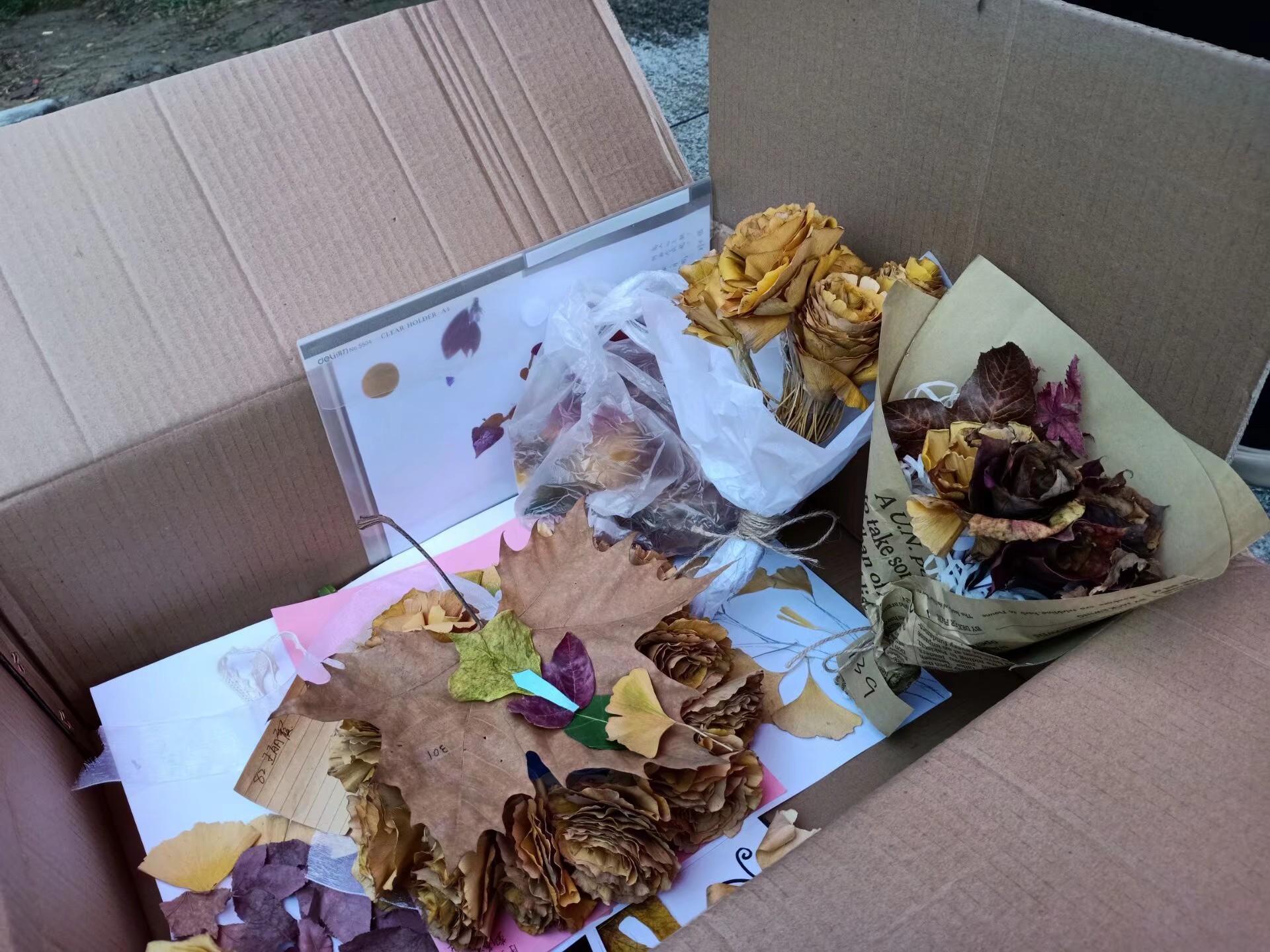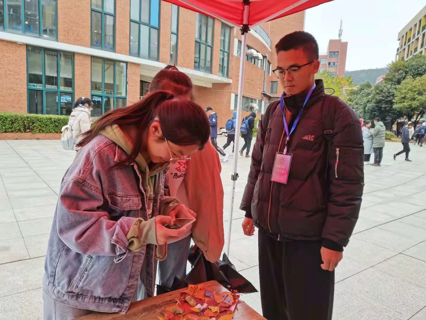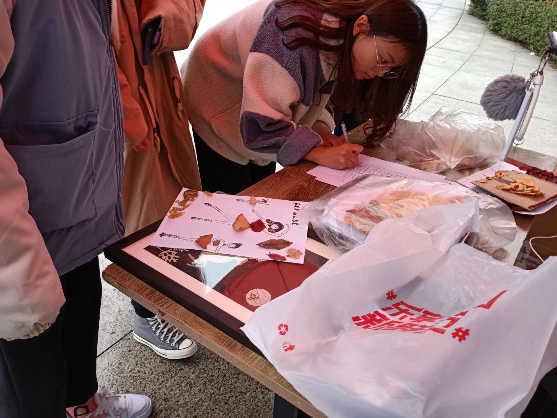 潇潇风雨中,值班人员坚守着工作岗位,活动参与者们陆续前来献上自己精心制作的落叶工艺品,经过的同学们也不时投来惊叹的目光。作品收集工作持续了四、五小时,收取的作品将被分类汇总并制作成展板,以用于之后的展示工作。