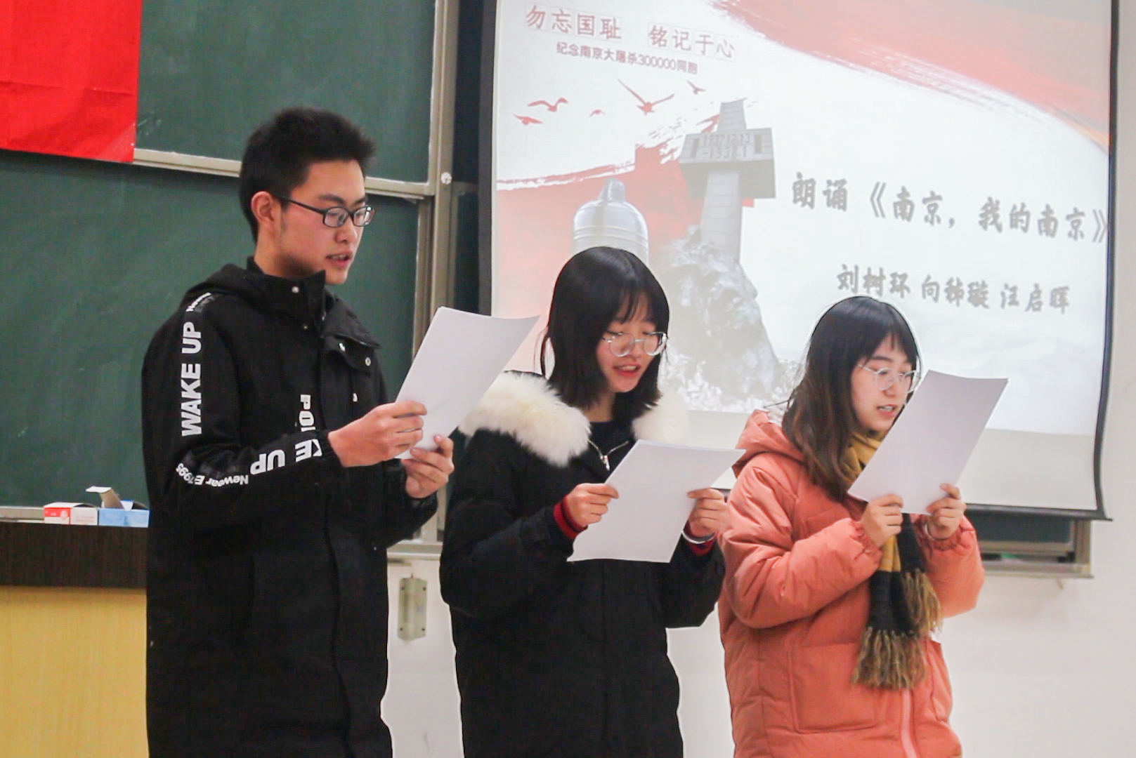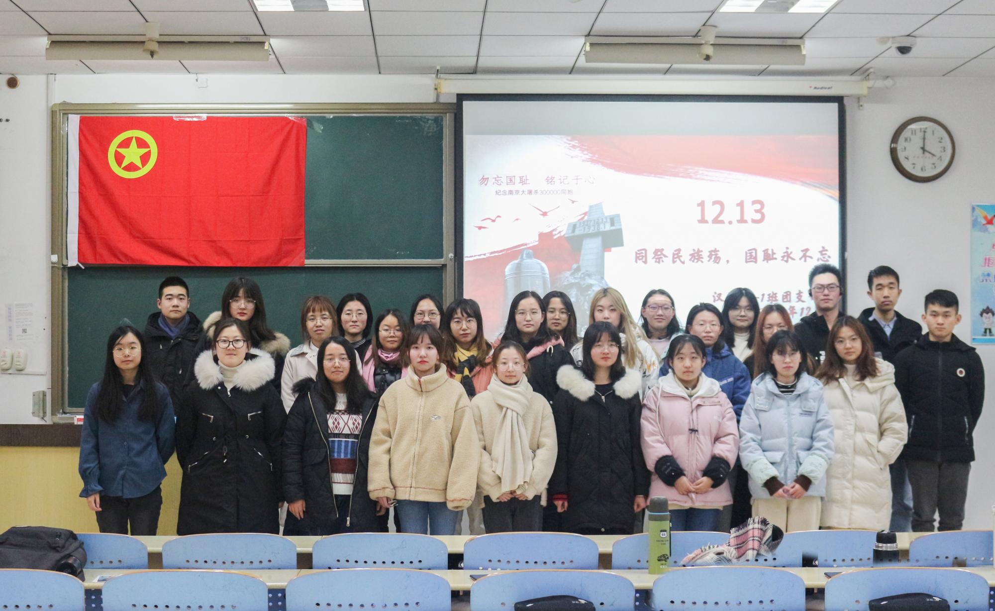 首先,全体同学观看了12月13日上午十时零一的南京街头默哀视频并观看了南京大屠杀历史资料视频,之后由刘振乾分享参观侵华日军南京大屠杀遇难同胞纪念馆的感受,他介绍了雕塑——“家破人亡”,并讲述参观者留言册的故事。接下来八组的成员分享自己对于南京大屠杀死难者国家公祭日的感想,殷懿蕃说:“我们不能忘记历史,我们要将那段屈辱的历史警示传达给每一代。”忘记历史就意味着背叛,而铭记不等于永远仇恨,正如杨欣然的发言:“国家公祭日的设立不仅是对死难同胞的缅怀纪念,对死难者家属微薄的慰藉,更是为了让施暴者和受害者反思历史、铭记历史;尊重生命、敬畏生命;珍视和平、维护和平。”曾经走过的苦难,最终都会成为中华民族前进的力量。其次,七组的刘树环、向秭璇和汪启晖朗诵了《南京,我的南京》,然后全体同学起立,同默哀视频一起,向南京大屠杀死难者和所有在日本帝国主义侵华战争期间惨遭日本侵略者杀戮的死难同胞致哀。最后,刘振乾总结道:军事法庭早已对南京大屠杀惨案作出定性和定论,是非曲直,昭然具在,铁证如山,不容篡改。我们反对战争、反对军国主义、法西斯主义,而不要阻碍中日人民之间的友谊。历经战争磨难的中国人民更加懂得和平的珍贵,我们坚信,“正义必胜,和平必胜,人民必胜”。