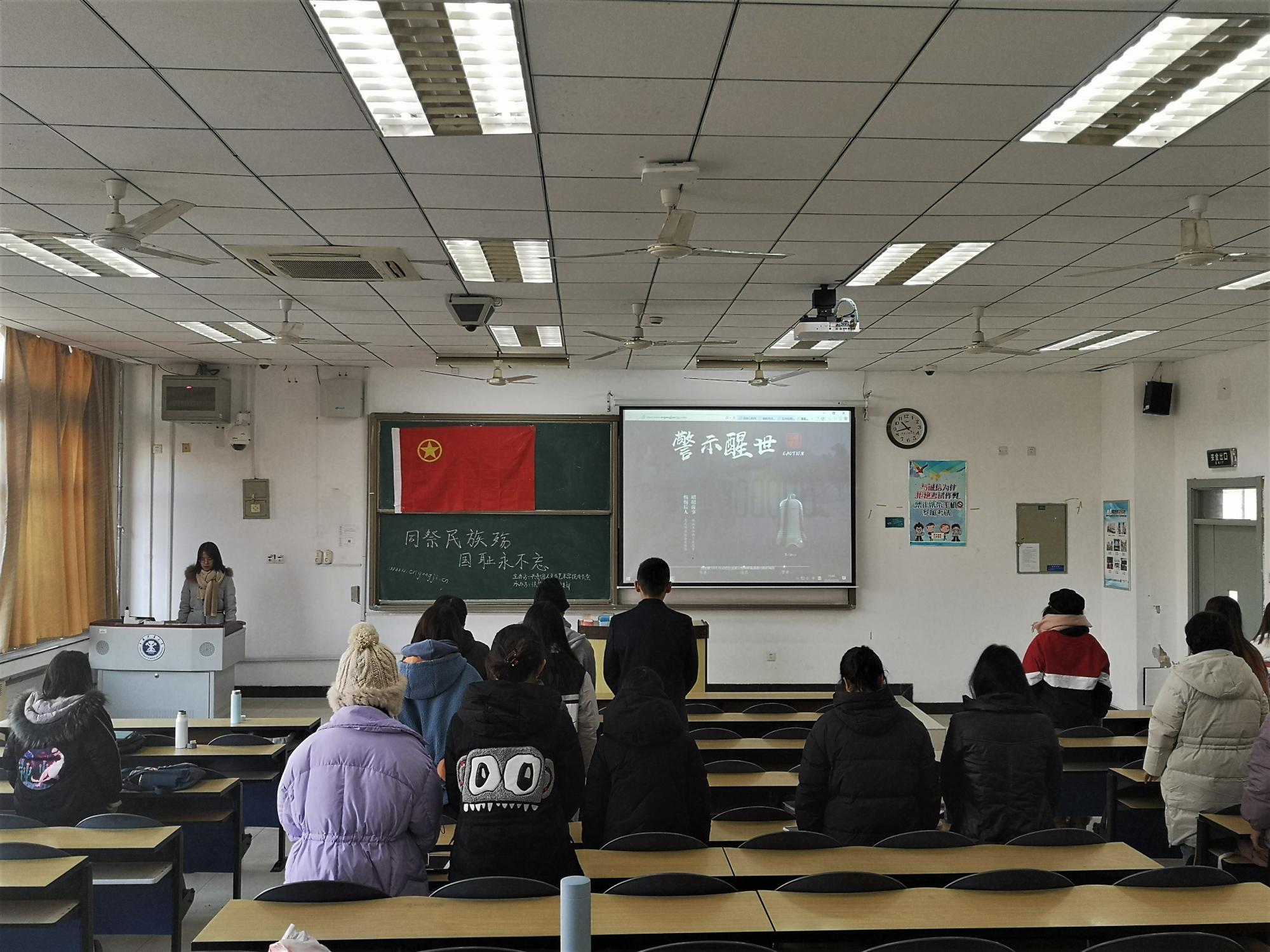首先,团支书刘潇潇同学组织大家观看了对于南京大屠杀亲历者的相关采访,老人们的回忆与叙述牵动着所有人的心。然后,刘潇潇同学向大家介绍了一位外籍摄影师克里斯马吉的事迹,观看了南京大屠杀的真实影像短片,回顾那段沉痛的历史,在场同学都陷入了沉思。紧接着,同学们通过视频资料和团支书的讲述了解了国家公祭日的由来,以及经历大屠杀之后民族在劫难中振兴的历程。在互动环节,同学们主动分享自己关于国家公祭日的感言,张晋博同学讲述了自己参观侵华日军南京大屠杀遇难同胞纪念馆的经历,他认为日本一些文化入侵冲淡了部分青年人的历史情感,新时代青年应正视历史,为民族振兴贡献力量。