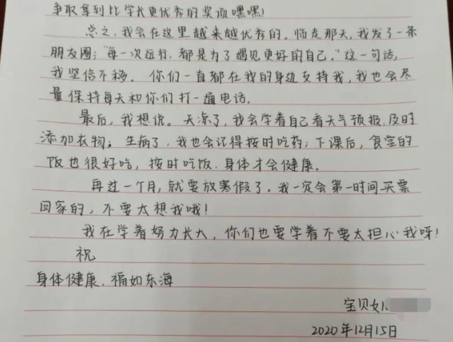 “谁言寸草心,报得三春晖。”父母的教养之恩,子女总无以为报。转瞬之间,同学们已经离家三月有余,心中不免怀有对小家的思念与对父母的相思、感激。“云中谁寄锦书来”,自古纸短情长,小小的信笺承载着悠长的情谊。