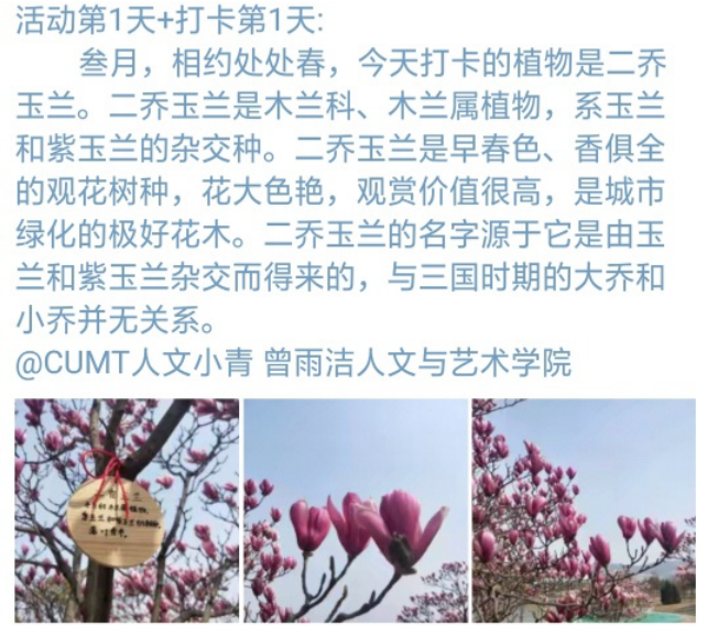 “春到海棠花几信”,“梨花淡白柳深青”。叁月,是春天的开始,也是探索的启程。在本次活动中,同学们积极参与,同学们用诗句和照片描绘春的气息,在打卡道路上含苞待放的花朵的同时,也用各色美食来完成对春的感受,挖掘家乡美食背后的历史故事,弘扬中国美食中的传统文化。同时,叁月既是春天月,也是雷锋月。同学们将人物和雷锋月主题联系起来,报道身边的好人好事,既感受了春天的温暖,也在春天传播正能量。