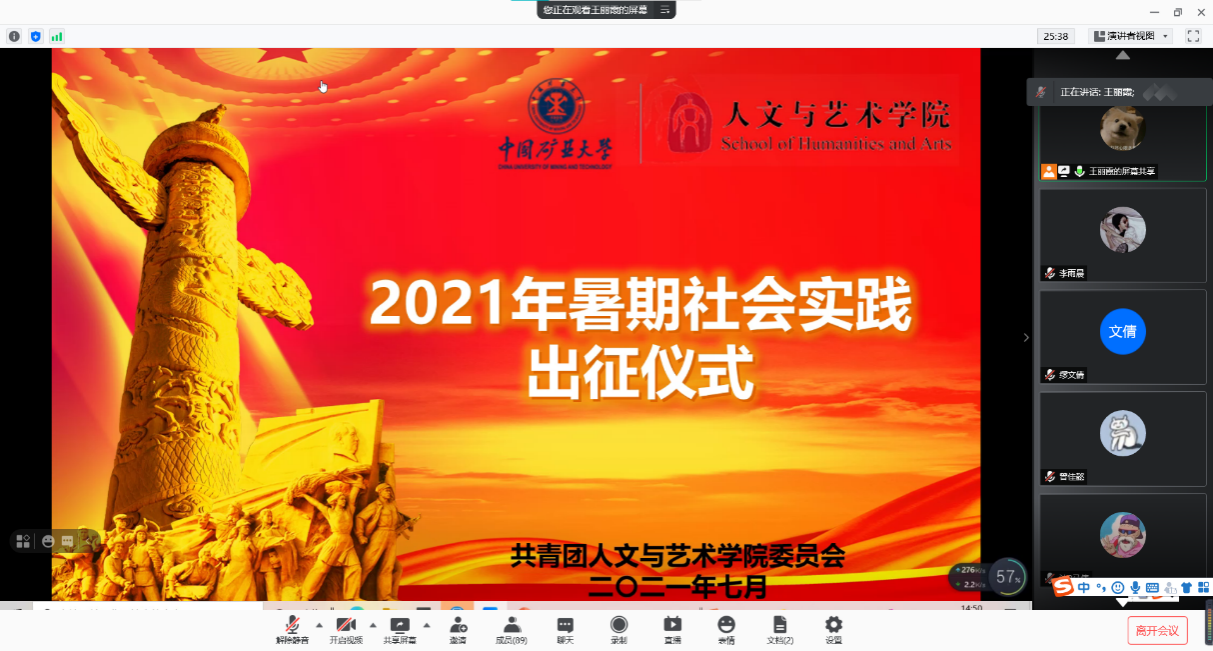 于线上召开了2021年暑期社会实践出征仪式。院团委书记郭丽婉老师、院学生会指导老师苏辉、往期社会实践优秀代表李少博、院团委实践部部长王丽霞、各实践团队成员以及宣传员陈思逸参加了本次出征仪式。