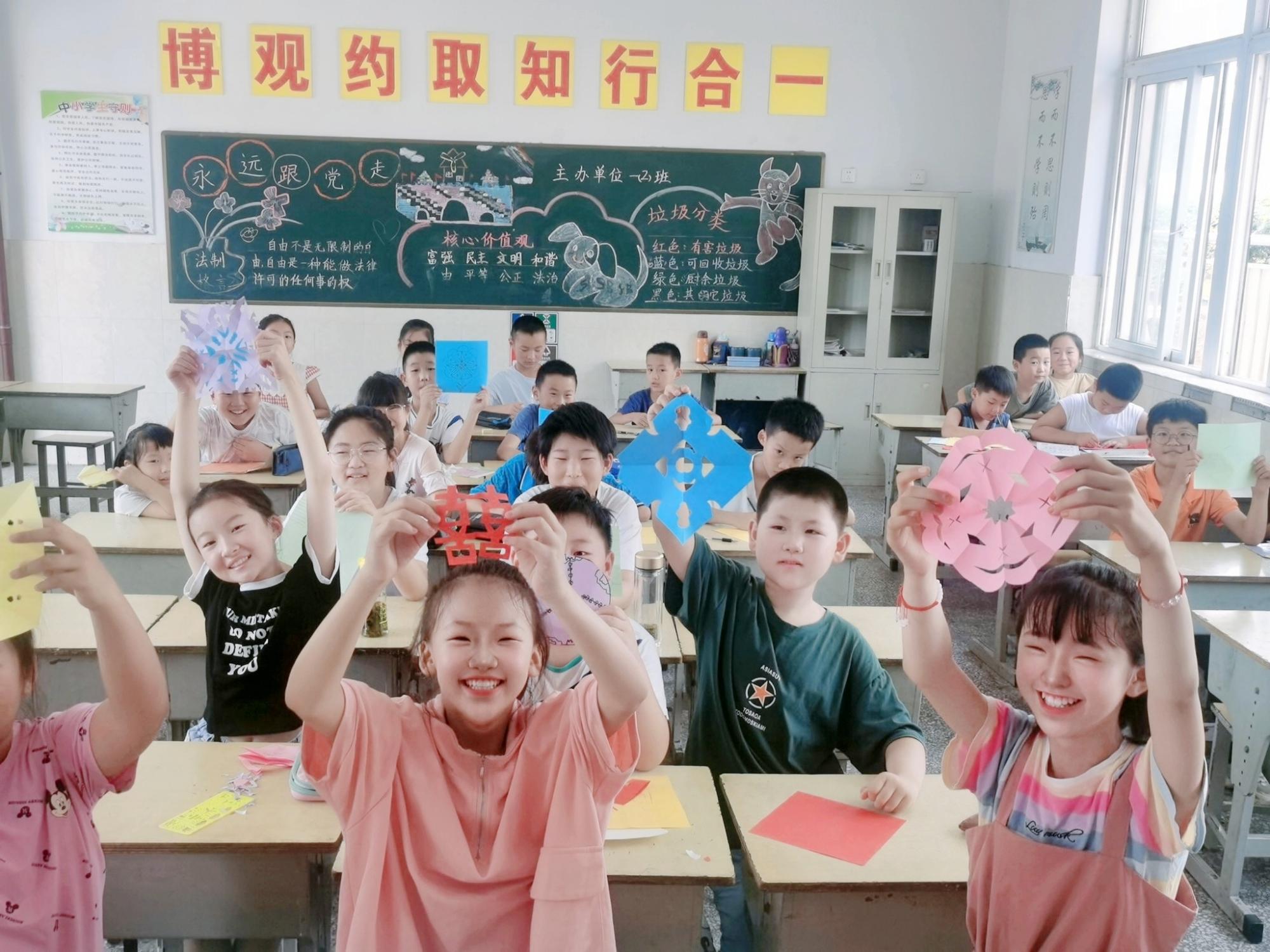 第一节“爱国教育”课堂上,同学们通过观看影视资料,了解了中华人民共和国成立初期的机遇与挑战,认识到志愿军在抗美援朝战争中的重要贡献,并进行了缅怀。第二节“趣味绘画”课堂上,同学们了解了纹样的类型与意义,并创作了自己的纹样剪纸作品。第三节“纸墨我心”课堂上,同学们对古代书信诗词《白头吟》、《醉花阴》的内容主旨及创作背景进行了一定程度的了解,并掌握了现代书信的基本格式。第四节“课业辅导”课上,同学们开始进行自我书信创作,创作出了一封封写给父母或老师的书信,并在信中尽情地表达了他们纯真的情感与美好的祝愿。
