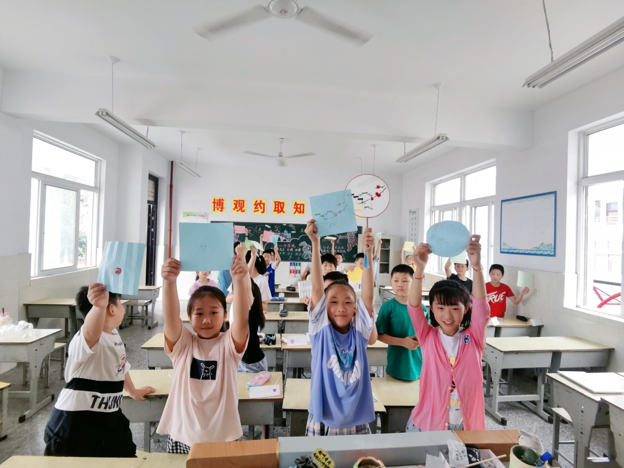 汉王小学原定24位小学生参与本次授课,下午一位同学慕名而来,增为25人。第一节课,朱宣颖组织孩子们到操场上,通过简易的肢体动作来表达自己的昵称,经过两轮的游戏,所有师生已互相认识了彼此,能叫出彼此的昵称,也将其写到了黑板上,作为本次活动一个美丽的见证。第二节课,是万笑颜的“趣味绘画”,她将有趣的绘画知识与中国传统的器物扇子相结合,与孩子们共同完成了一把把美丽多彩的扇子。下午开启第三节课是孟宇的“声声入耳”,孟宇带领同学们用击鼓传花的方式,激励孩子们勇于放出歌喉。同学们在本堂课都演唱了自己心爱的歌曲,唱出了童年的欢乐与灿烂。第四节课为朱宣颖的“纸墨我心”,本课讲授了李白的《梦游天姥吟留别》、海子的《面朝大海,春暖花开》、博尔赫斯的《我用什么才能留住你》。本课大体介绍了这三首诗的创作背景,并播放了相关短片,让孩子们更直观感受到诗歌的魅力。此外,还进行了诗中生僻字的解读、古汉语的讲解以及诗歌朗诵。