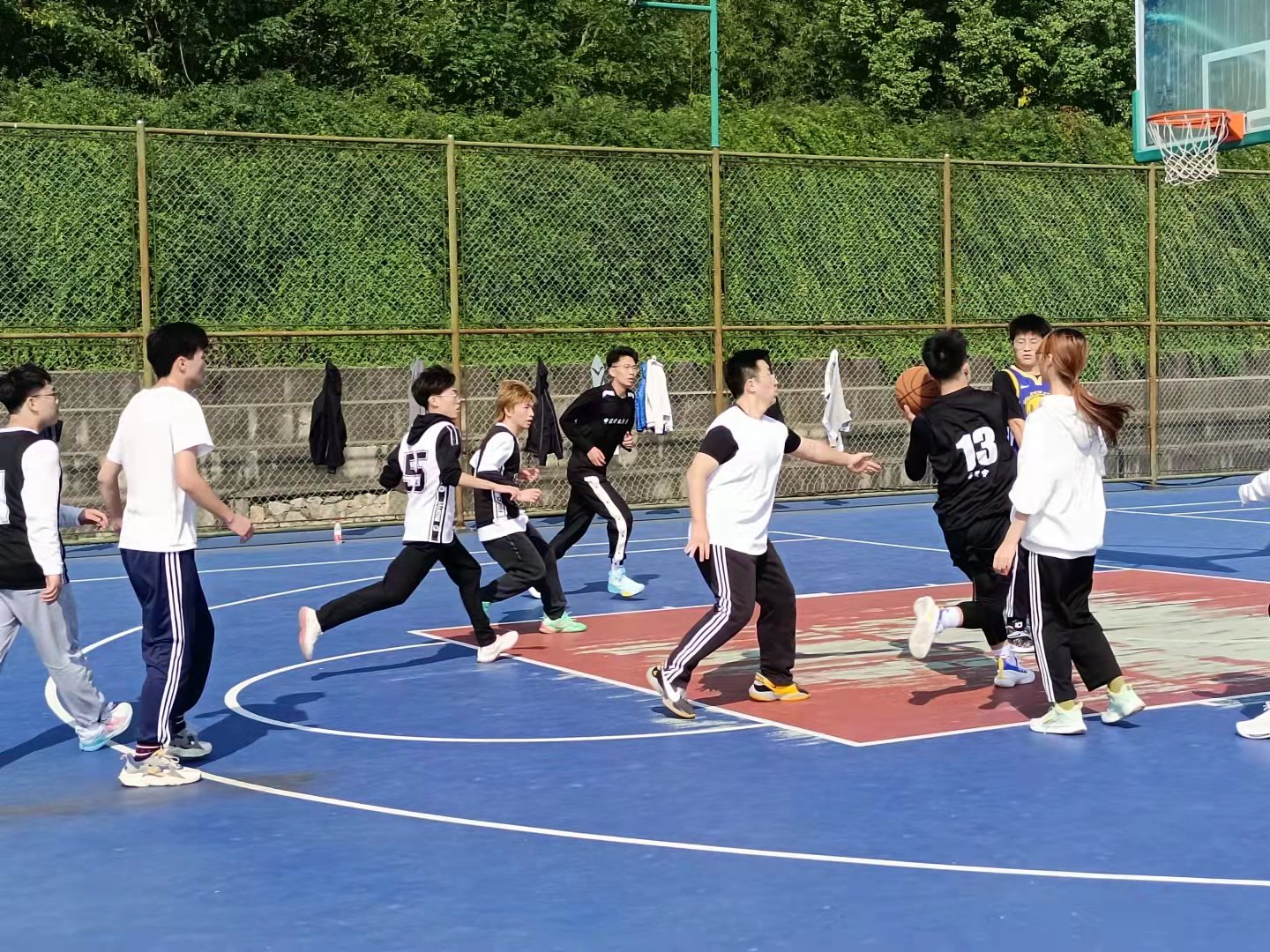 比赛分为三个部分,分别是大一赛,大二赛以及三分球娱乐赛。每支队伍由3名男生和2名女生组成,队伍内部气氛活跃、队员团结互助,充分体现了必发