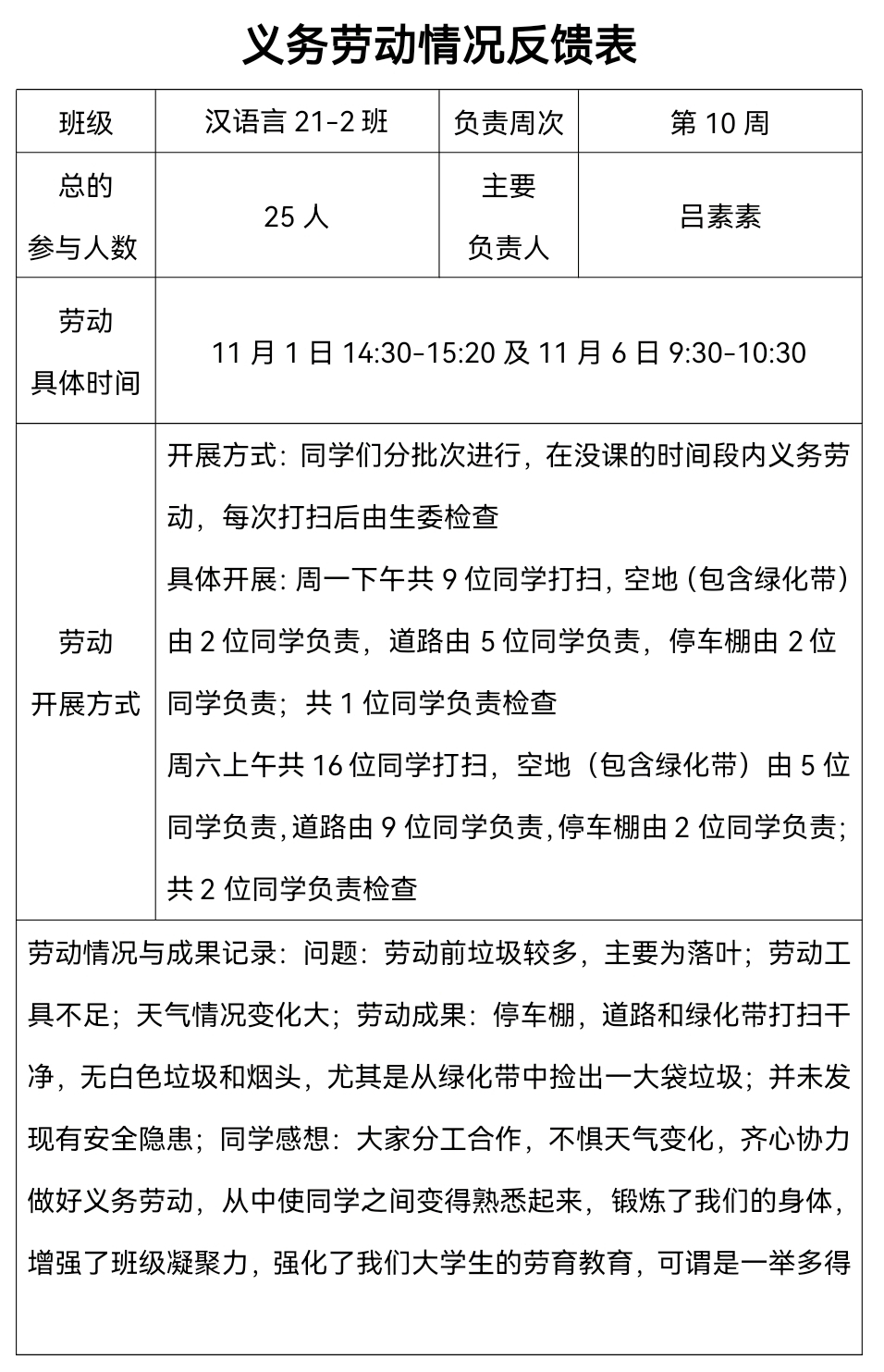 积极响应学校要求,于2021年10月11日至2022年1月9日,即秋学期第6—19周期间开展“弘扬劳动精神,共建美好校园”义务劳动活动。