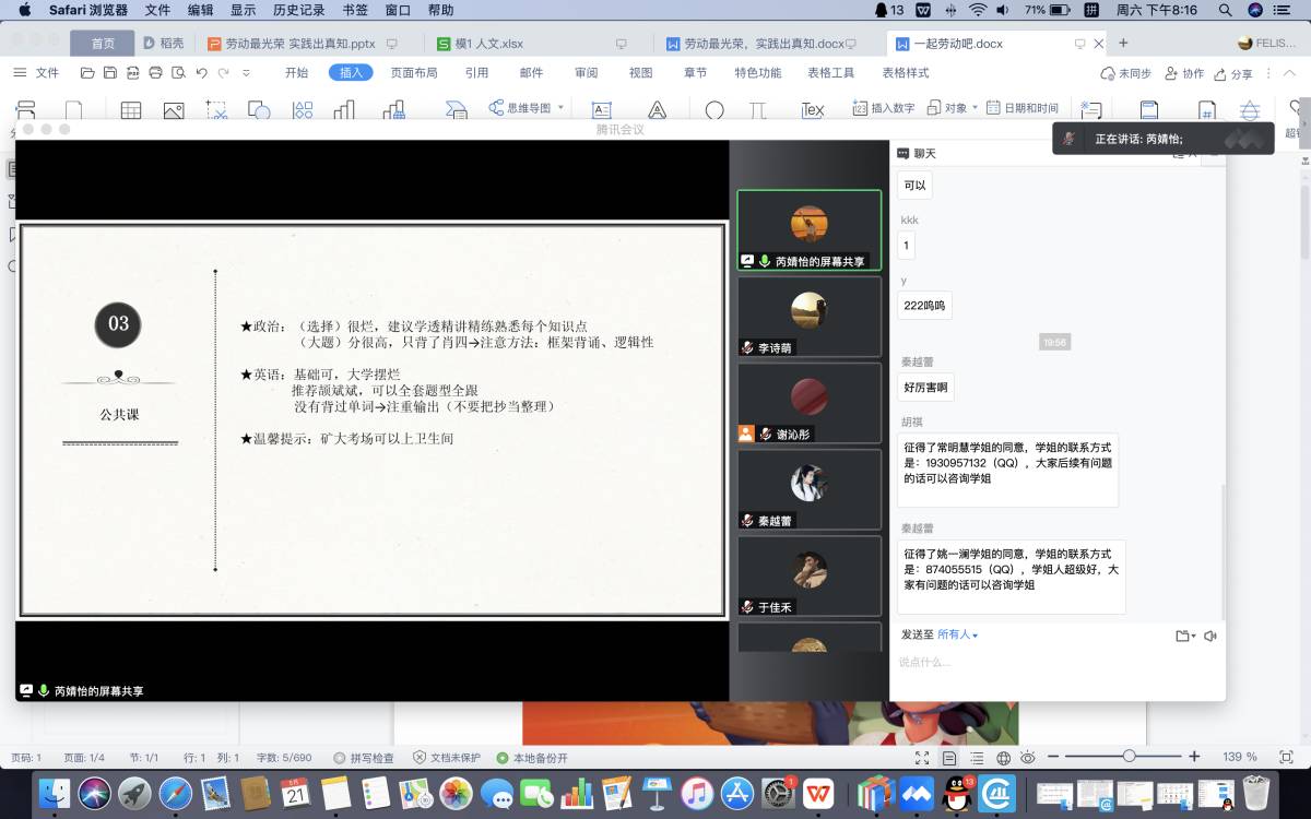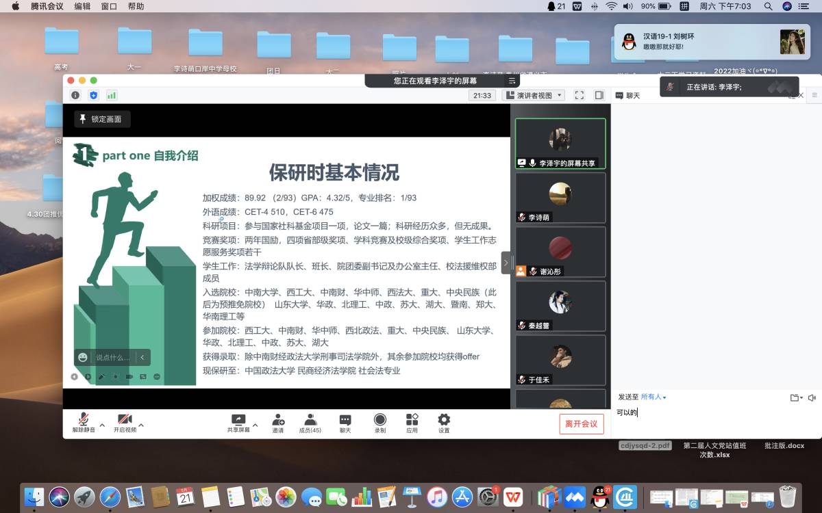 在本次活动中,2018级的同学们从个人定位与院校选择、文书准备和简历问答以及专业课的复习等几个方面,详细讲解保研全过程。同时,从细节出发,分享了个人备考顺序与积极自我调适的方法,并推荐了优秀老师。参会的同学们表示此次活动获益匪浅。