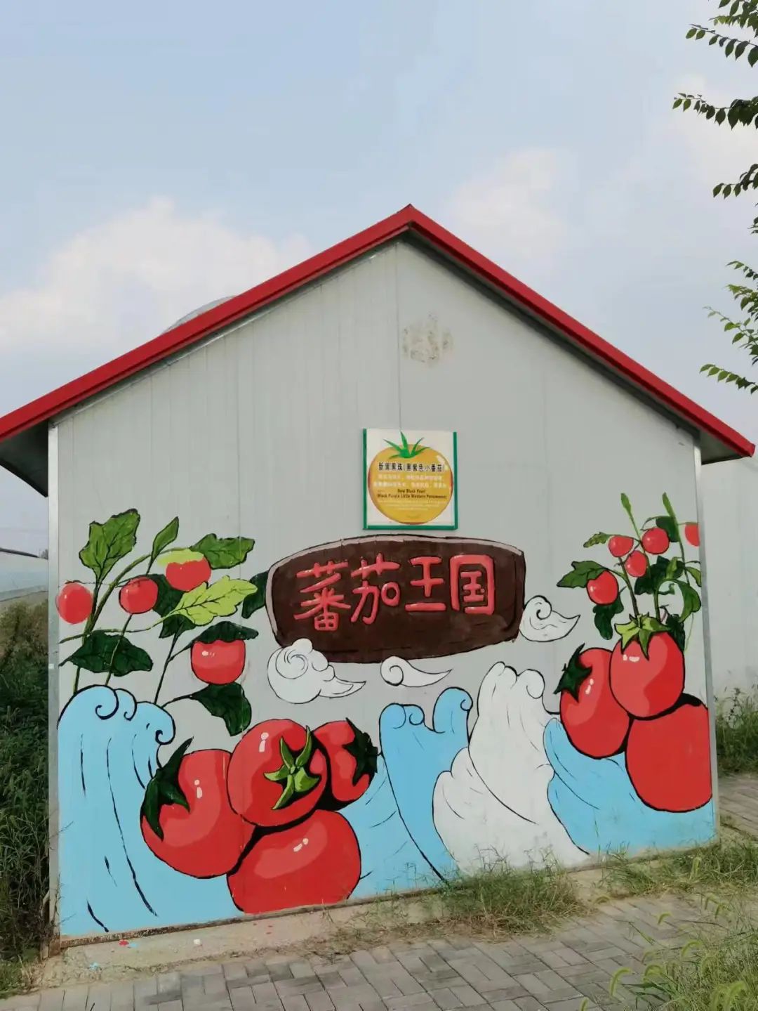 活动中,实践团成员分组合作,分工明确,根据构思好的绘画图案,以丙烯、喷漆等为绘画材料进行调色勾勒,挥笔涂绘,最终完成涵盖生态文明及番茄王国发展等内容的墙绘作品。在绘制过程中,实践团成员还邀请村里的小朋友一起进行绘画,主题鲜明、栩栩如生的墙体彩绘不仅装饰了番茄王国产业园,还成为传播文明的窗口。经过团队成员的共同努力,为期两天的“手绘乡村”实践活动顺利完成,11幅作品跃然于墙面,与村庄合成一幅精美的乡村画卷。