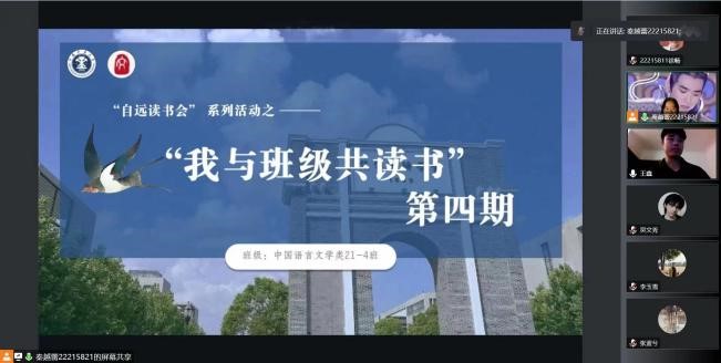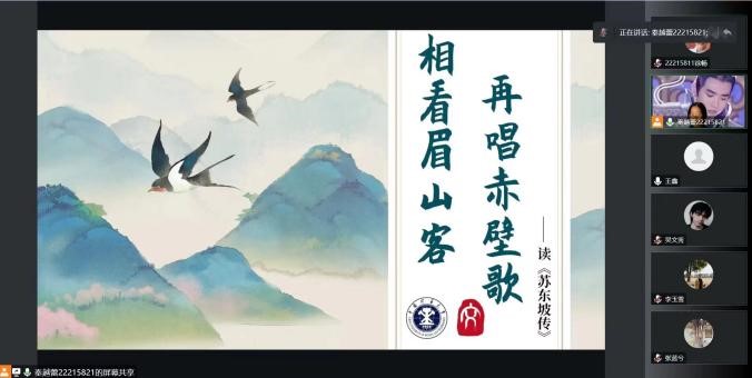 中国语言文学类21-4班在腾讯会议上开展了第四期“我与班级共读书”线上读书交流会。此次读书交流会围绕林语堂先生的《苏东坡传》,同学们展开热烈的讨论。此次读书会由班长秦越蕾主持,汉语21-4班全体同学及辅导员李玉雪老师、班主任王鑫老师参会。