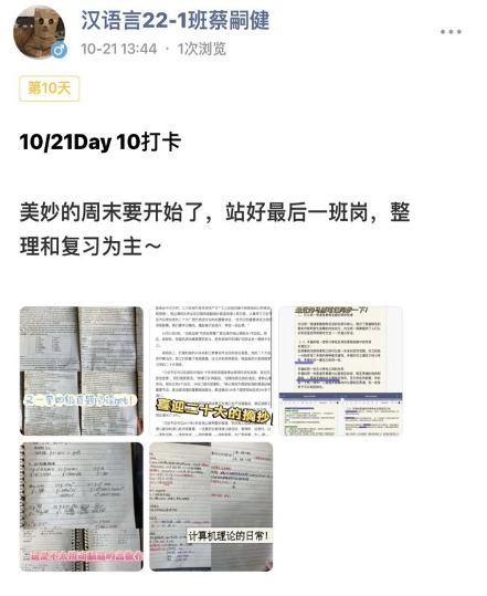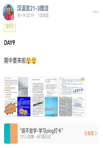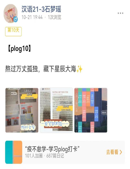 青衿之志,履践致远;行远自迩,笃行不怠。打卡活动举办以来,同学们踊跃报名,积极参与,以线上学习plog打卡的方式展示自己的学习成果,养成了良好的学习习惯,收获了学习乐趣。活动也展现了必发
