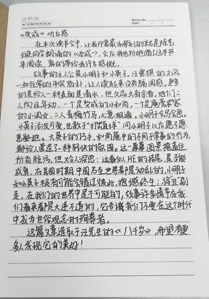12月2日,活动负责人组织开展了准备工作。12月2日至12月4日,志愿者们自由选阅文学作品,或诵一篇诗赋,品先贤求索之旨;或看一段历史,忆往昔峥嵘岁月。志愿者们遨游于书海之中,记录每一份悸动与感动,为能在分享会展示心目中的美文而努力。12月5日,志愿者们陆续到博四A202参与读书分享会,并在分享会上为大家诵读提前准备的典籍文段,其余志愿者在聆听后,选取最触动自己的内容写下读后感。其中,有同学写阅读《红楼梦》之后的感悟,还有写《我与地坛》中史铁生的悲惨遭遇,并抒发自己的真知灼见。最后,活动负责人在群内分享了这些优秀的读后感。