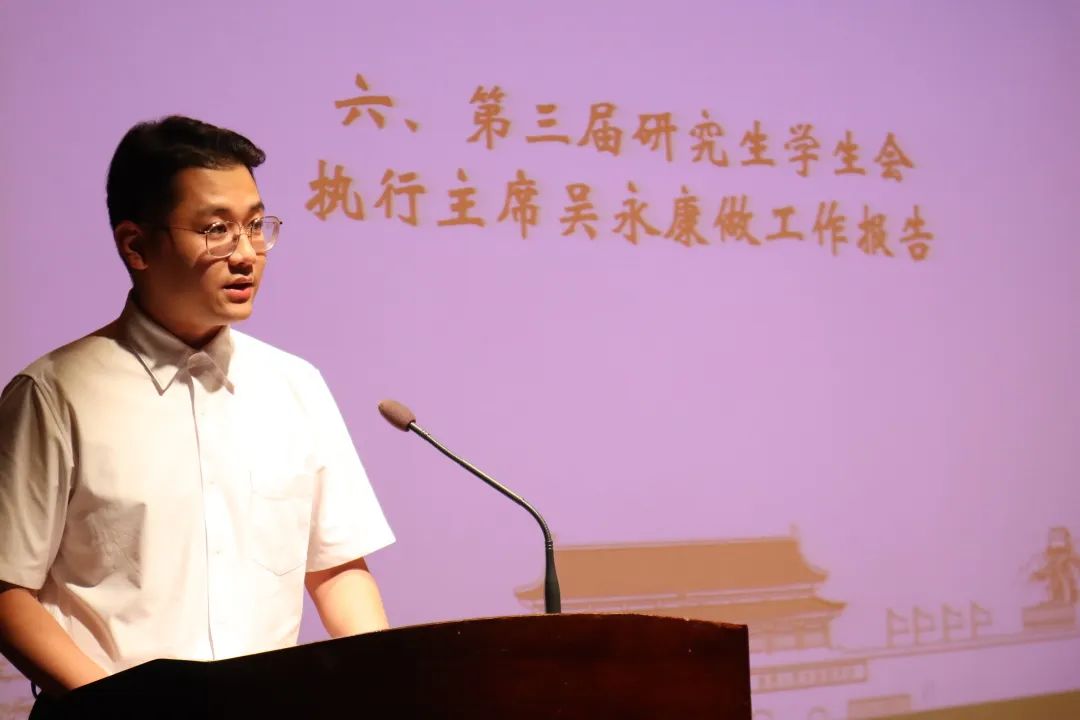 研究生会执行主席吴永康总结了上一年度研究生会在组织结构、党建纪律、服务职能、品牌活动、宣传形式方面取得的成绩。研会将遵守章程、端正态度、注意细节、乐于奉献的工作作风贯穿研究生会的始终,得到了各级领导和广大同学的一致认可。“乘风好去,长空万里,直下看山河,心有所系,风能行远。”吴永康表示院研会将始终不忘初心,笃行致远。